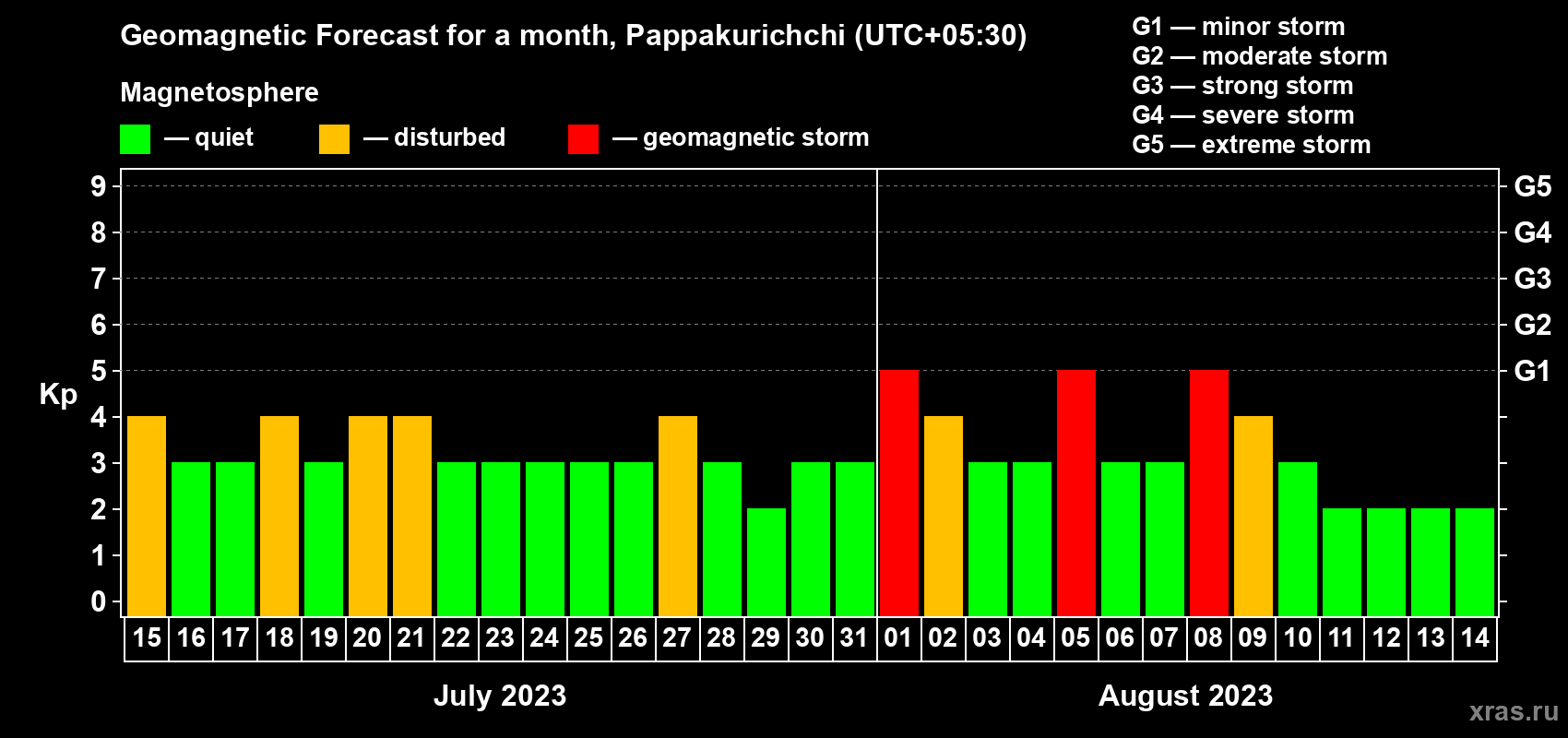 Geomagnetic storm forecast in Pappakurichchi for Jul 15, 2023