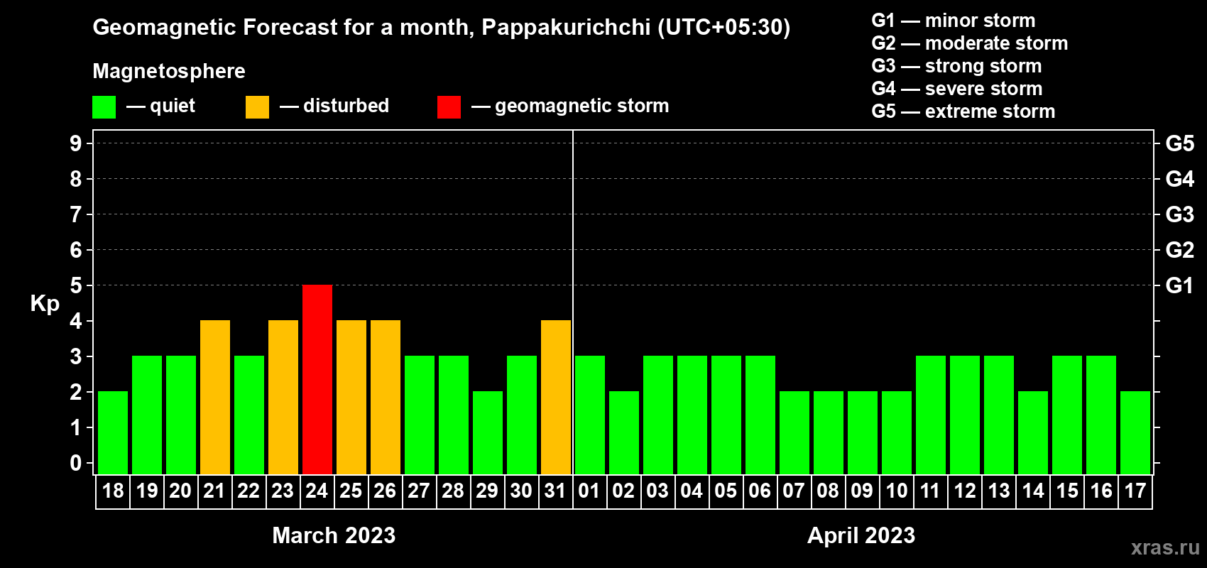 Geomagnetic storm forecast in Pappakurichchi for Mar 18, 2023