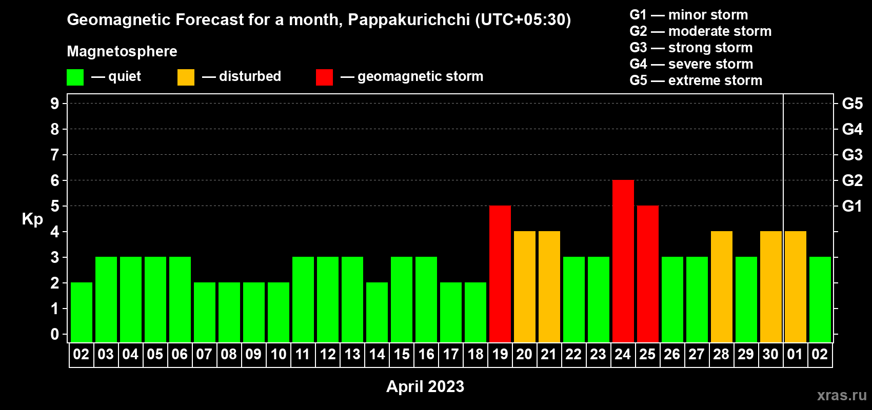 Geomagnetic storm forecast in Pappakurichchi for Apr 02, 2023