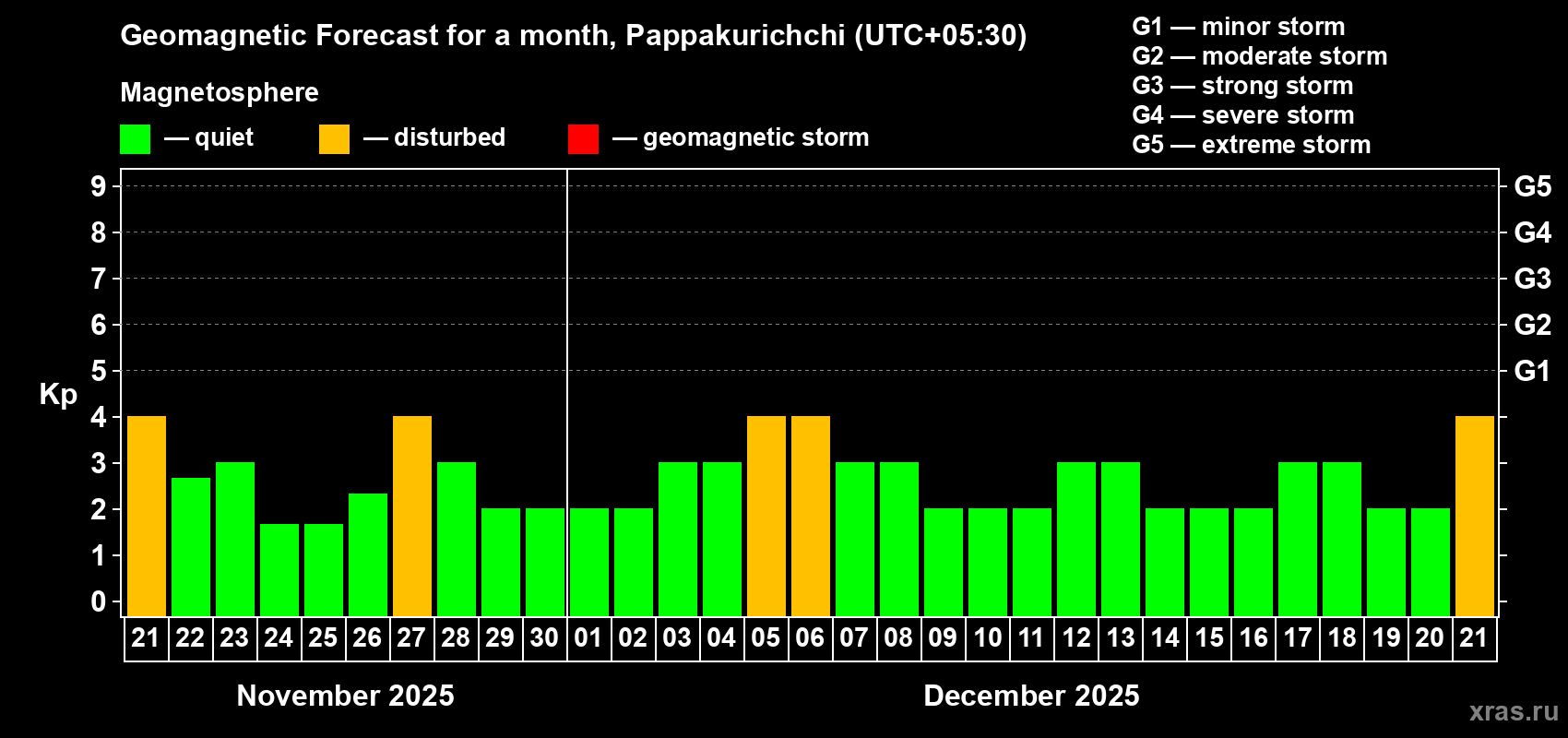 Geomagnetic storm forecast in Pappakurichchi for Nov 21, 2025