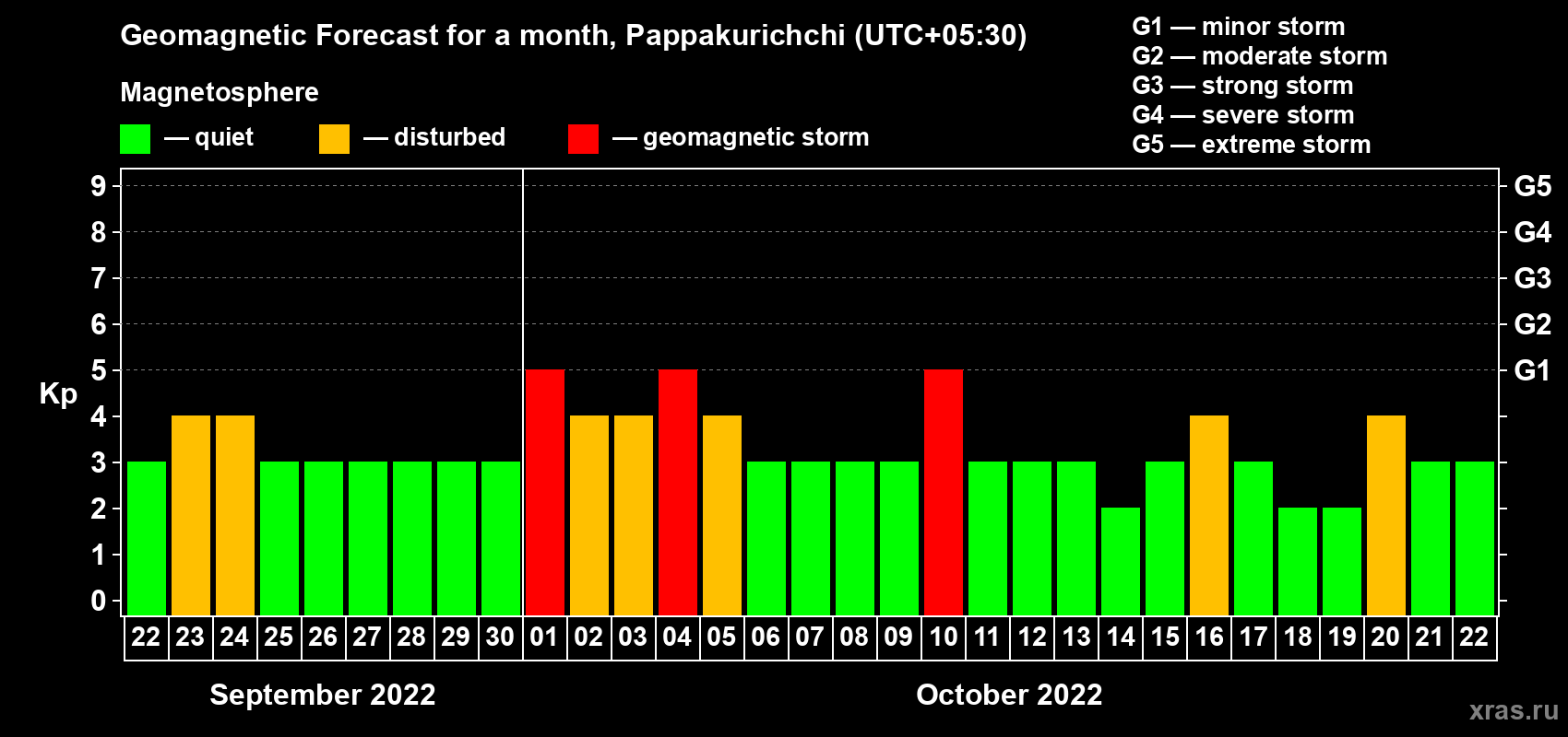 Geomagnetic storm forecast in Pappakurichchi for Sep 22, 2022