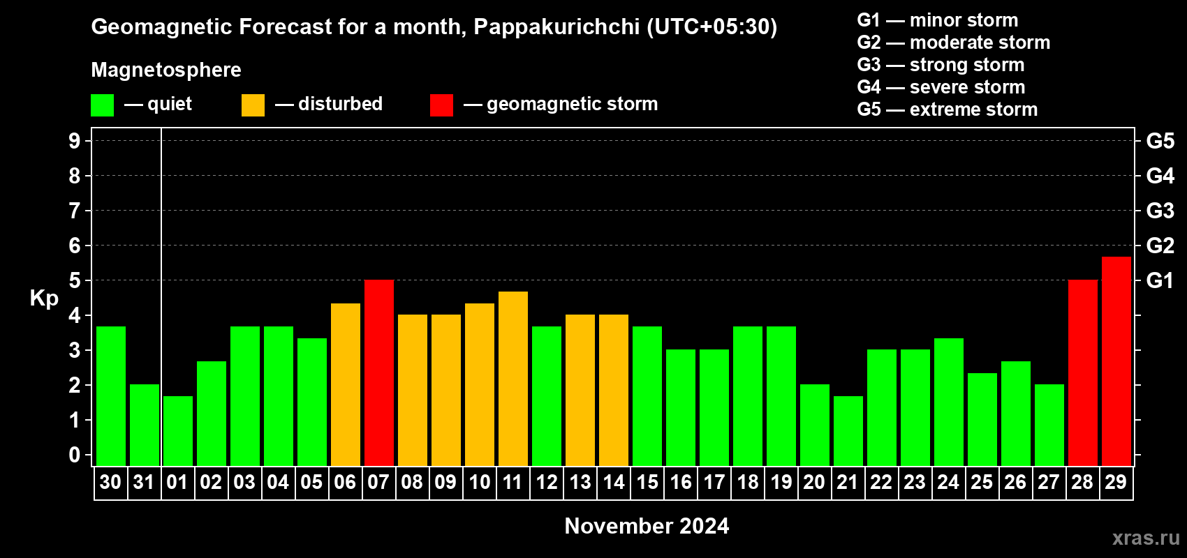 Geomagnetic storm forecast in Pappakurichchi for Oct 30, 2024