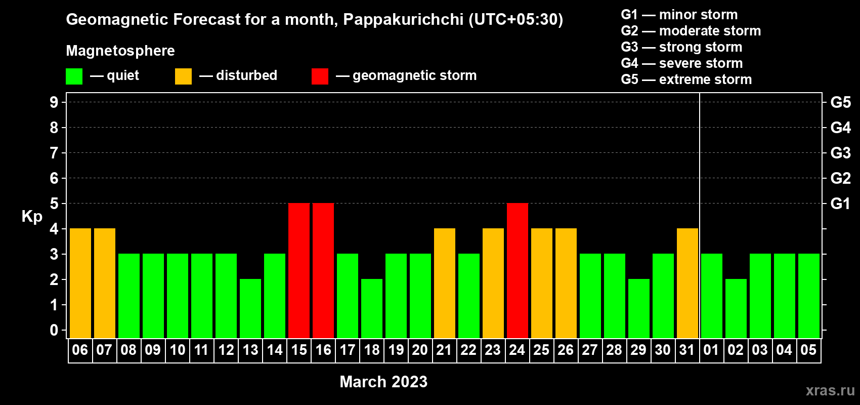 Geomagnetic storm forecast in Pappakurichchi for Mar 06, 2023