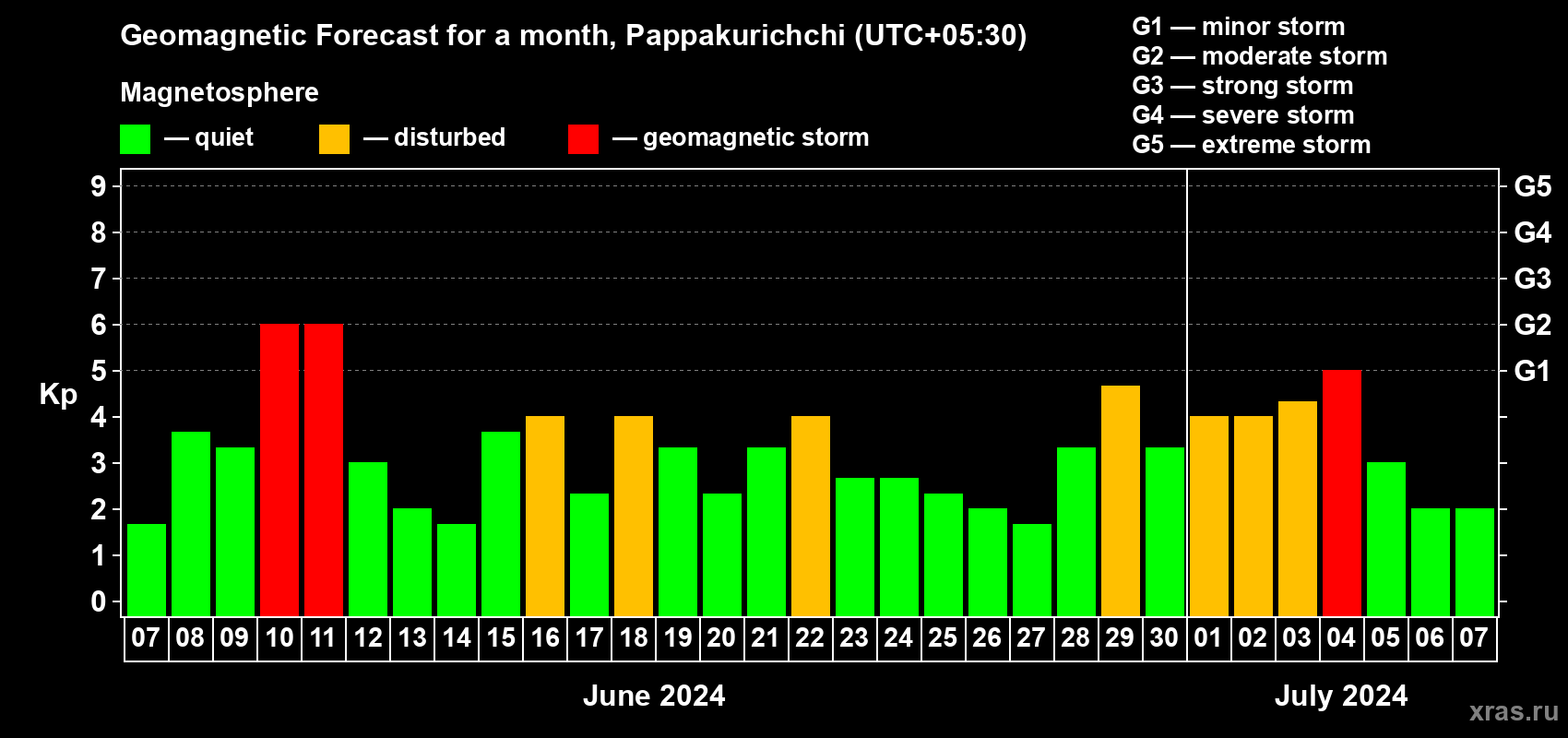 Geomagnetic storm forecast in Pappakurichchi for Jun 07, 2024