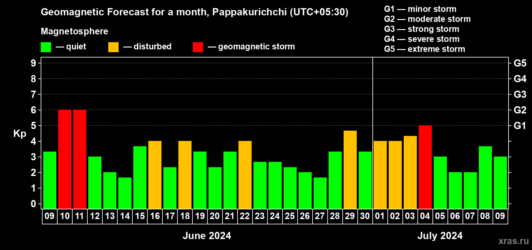 Geomagnetic storm forecast in Pappakurichchi for Jun 09, 2024
