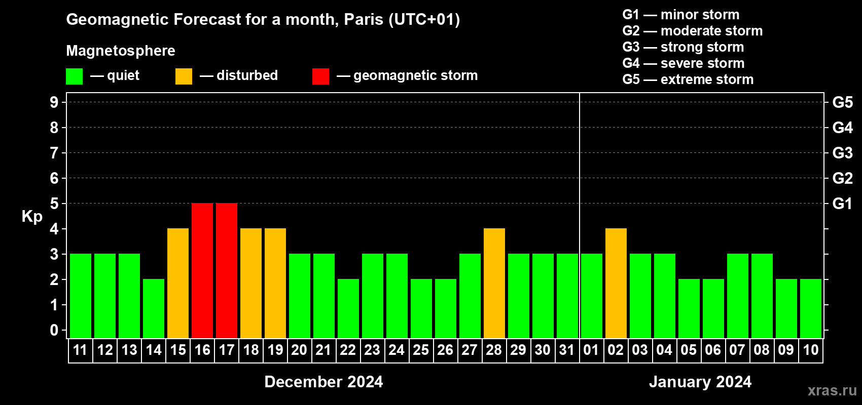 Geomagnetic storm forecast in Paris for Dec 11, 2023