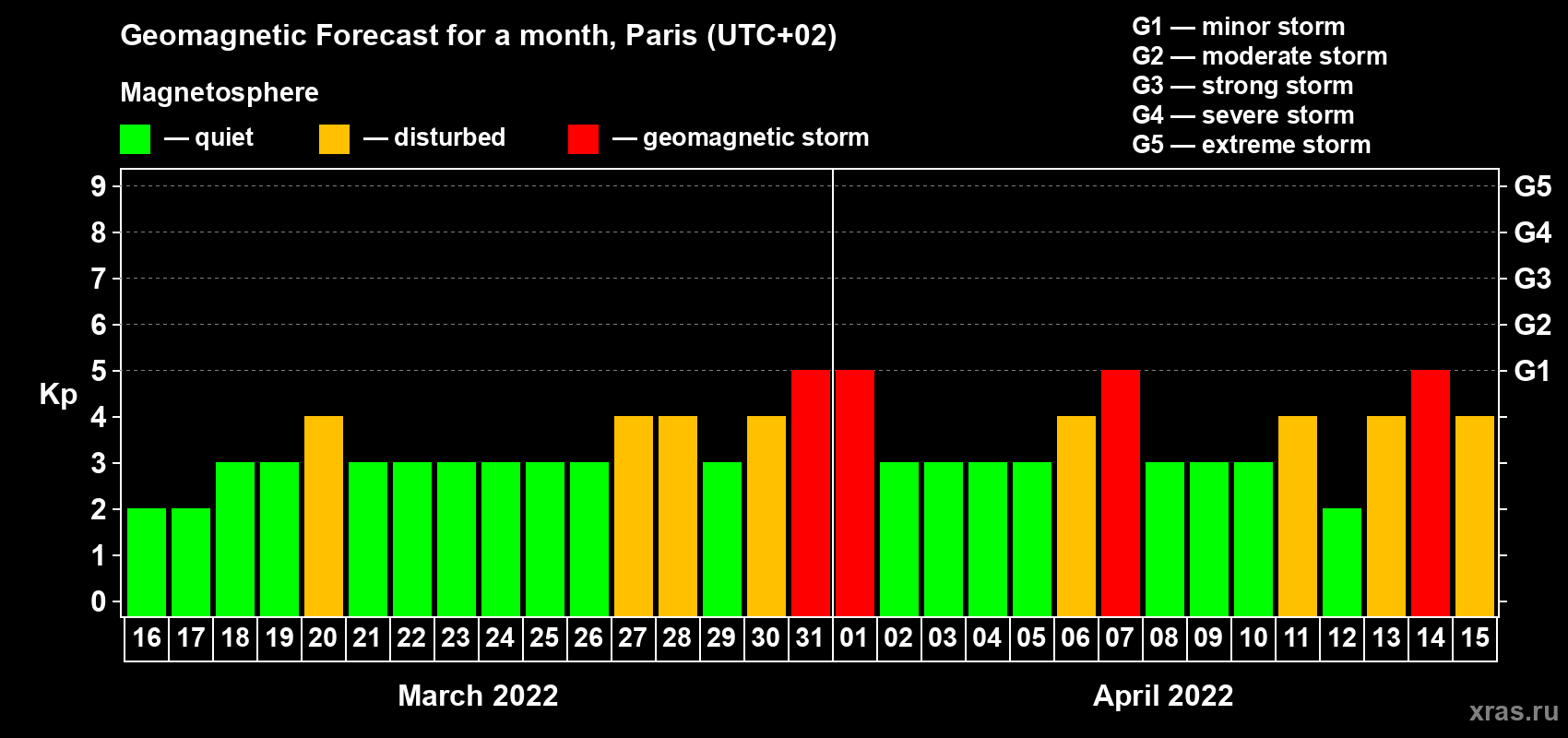 Geomagnetic activity forecast in Paris — Mar 16, 2022