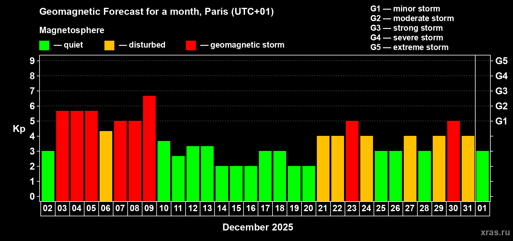 Geomagnetic storm forecast in Paris for Dec 02, 2025