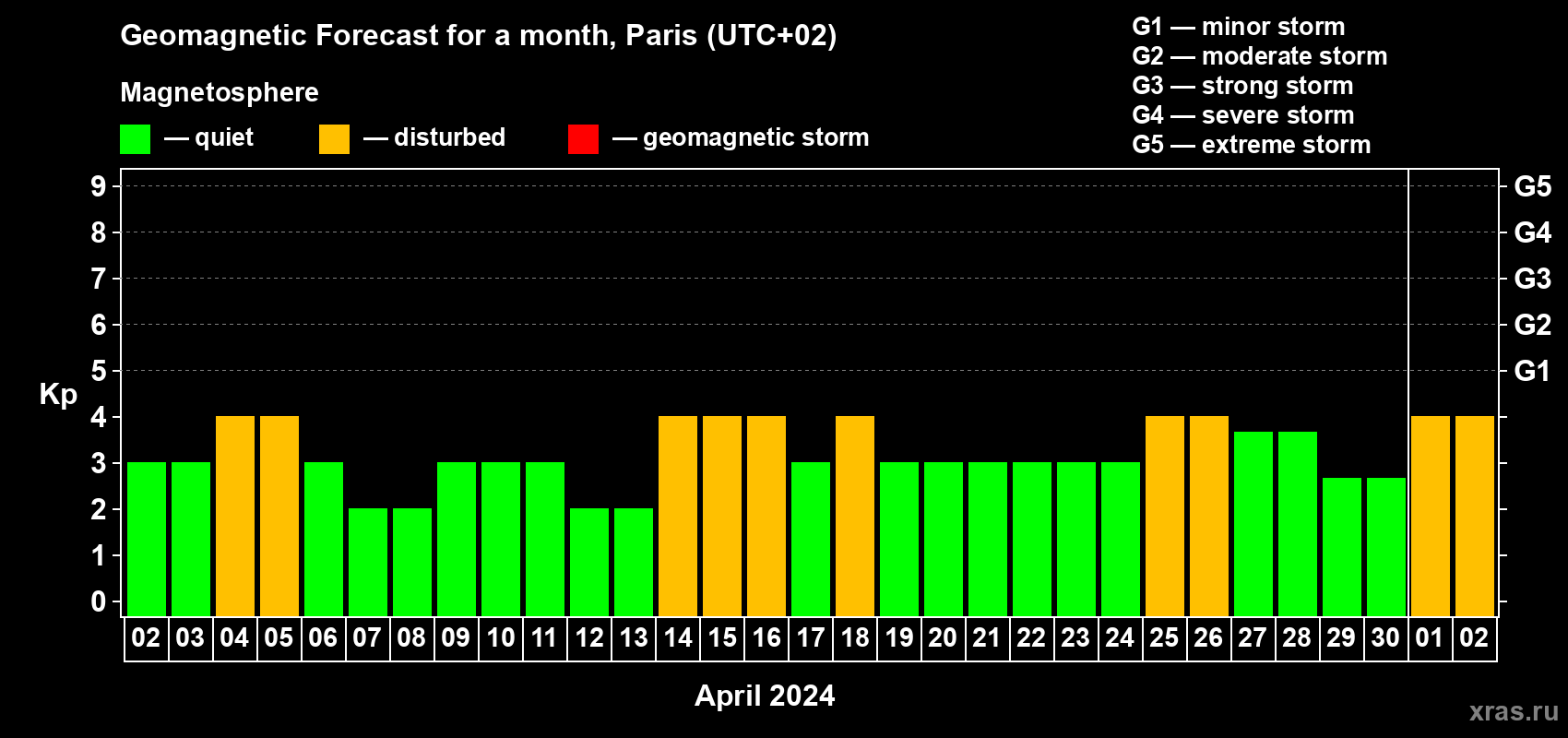 Geomagnetic storm forecast in Paris for Apr 02, 2024
