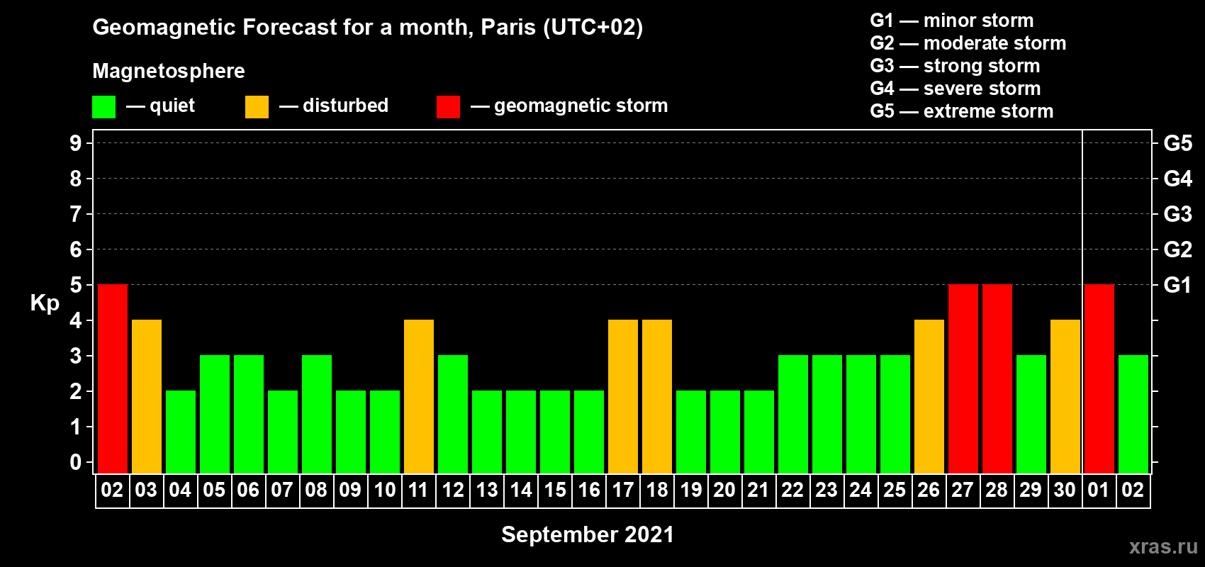 Geomagnetic storm forecast in Paris for Sep 02, 2021