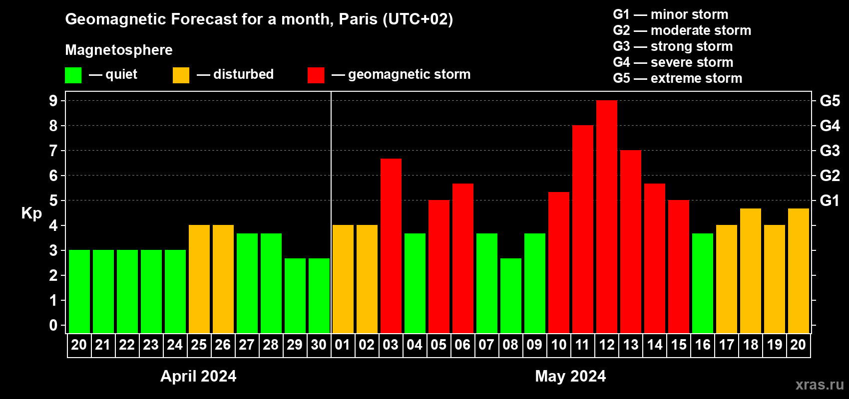 Geomagnetic storm forecast in Paris for Apr 20, 2024