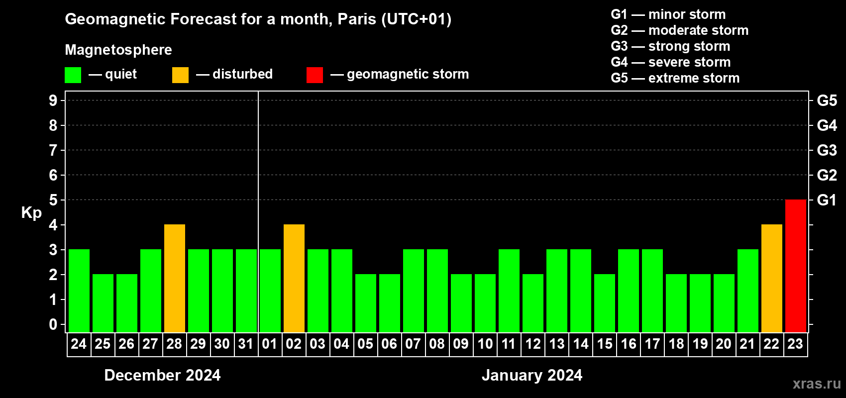 Geomagnetic storm forecast in Paris for Dec 24, 2023