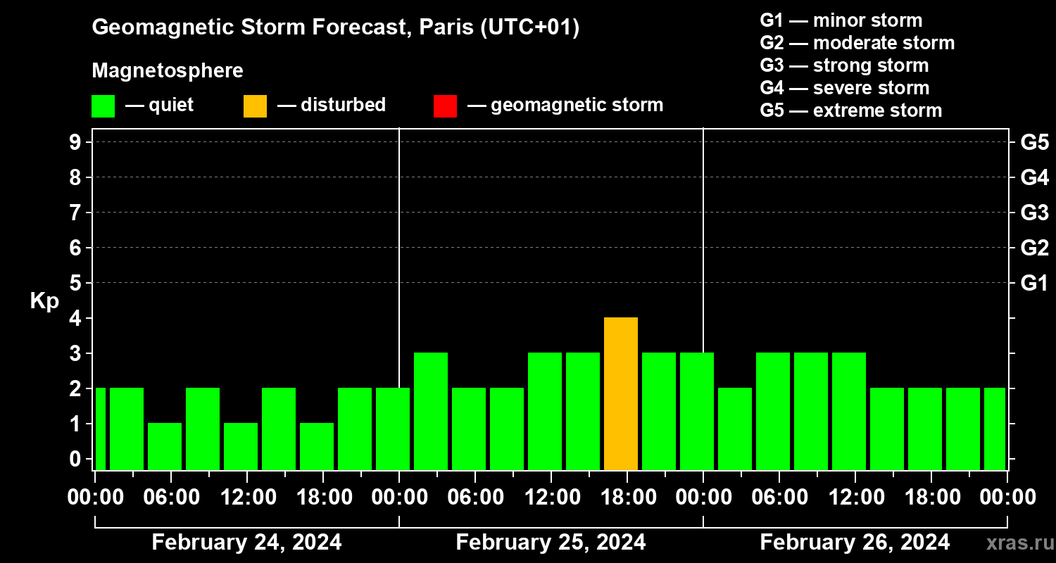 Geomagnetic storm forecast in Paris for Feb 24, 2024