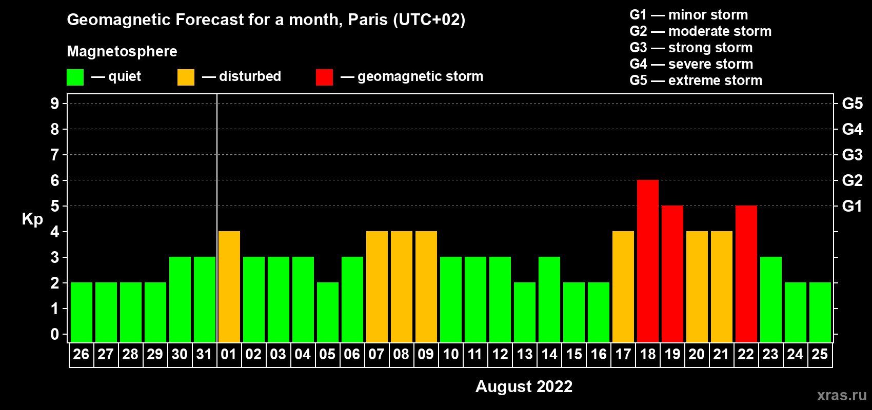 Geomagnetic storm forecast in Paris for Jul 26, 2022