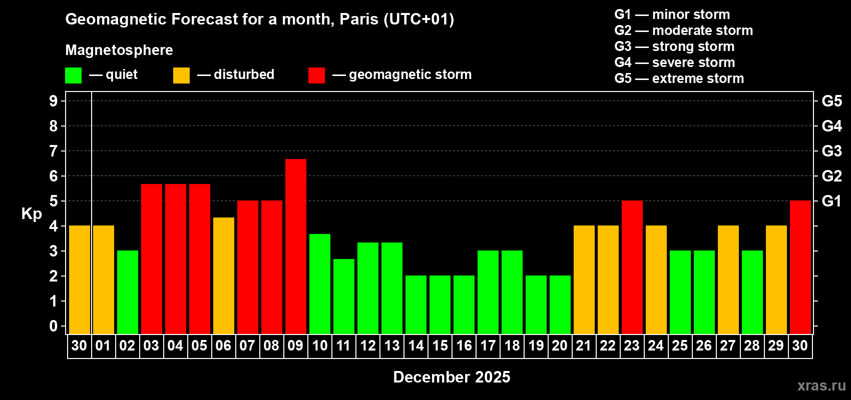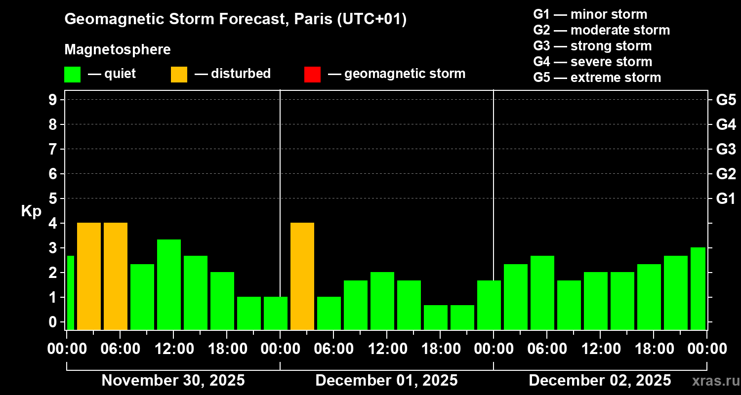 Geomagnetic storm forecast in Paris for Nov 30, 2025