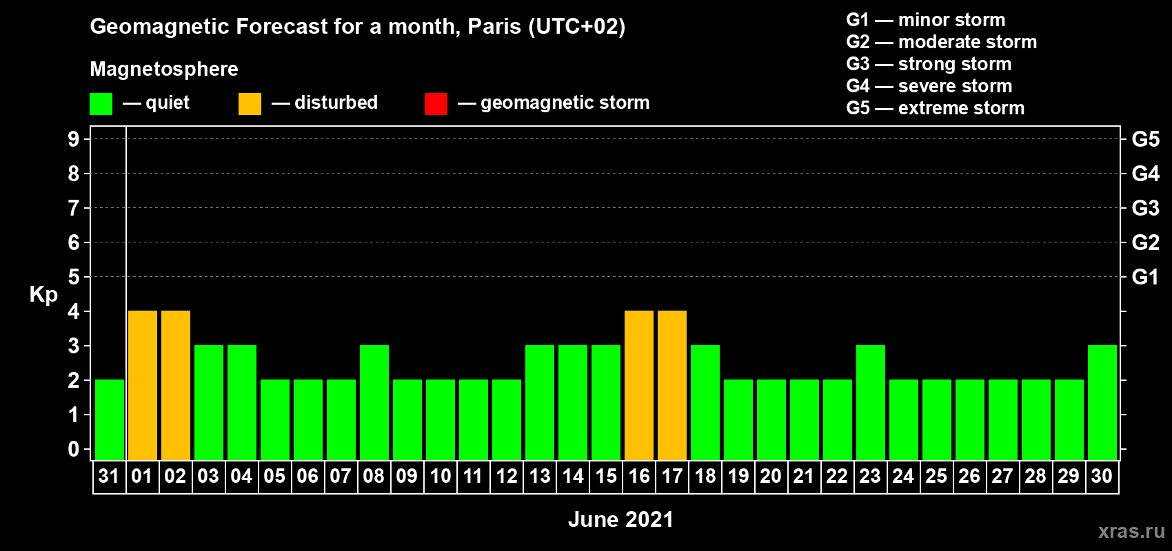 Geomagnetic activity forecast in Paris — May 31, 2021