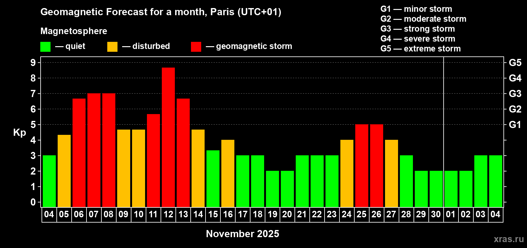 Geomagnetic storm forecast in Paris for Nov 04, 2025