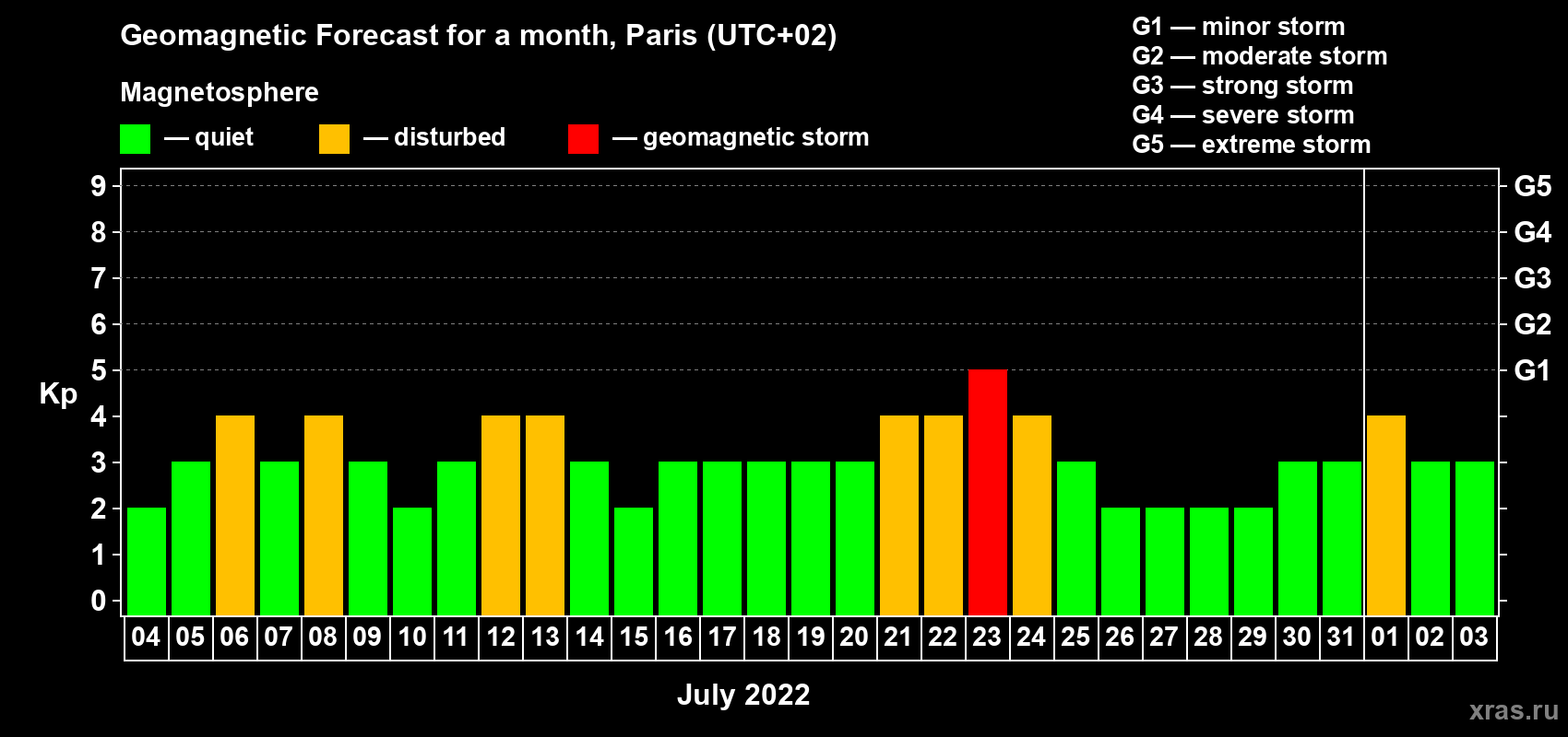 Geomagnetic storm forecast in Paris for Jul 04, 2022