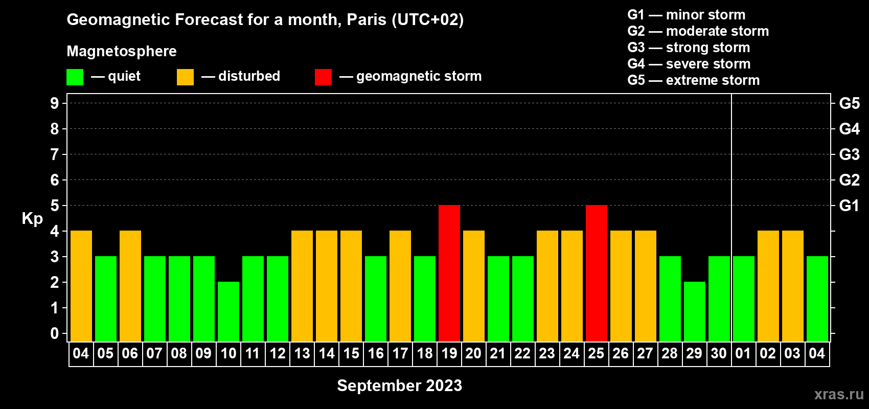 Geomagnetic storm forecast in Paris for Sep 04, 2023