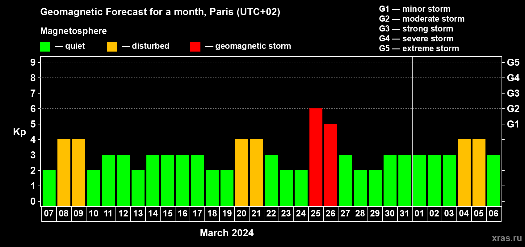 Geomagnetic storm forecast in Paris for Mar 07, 2024