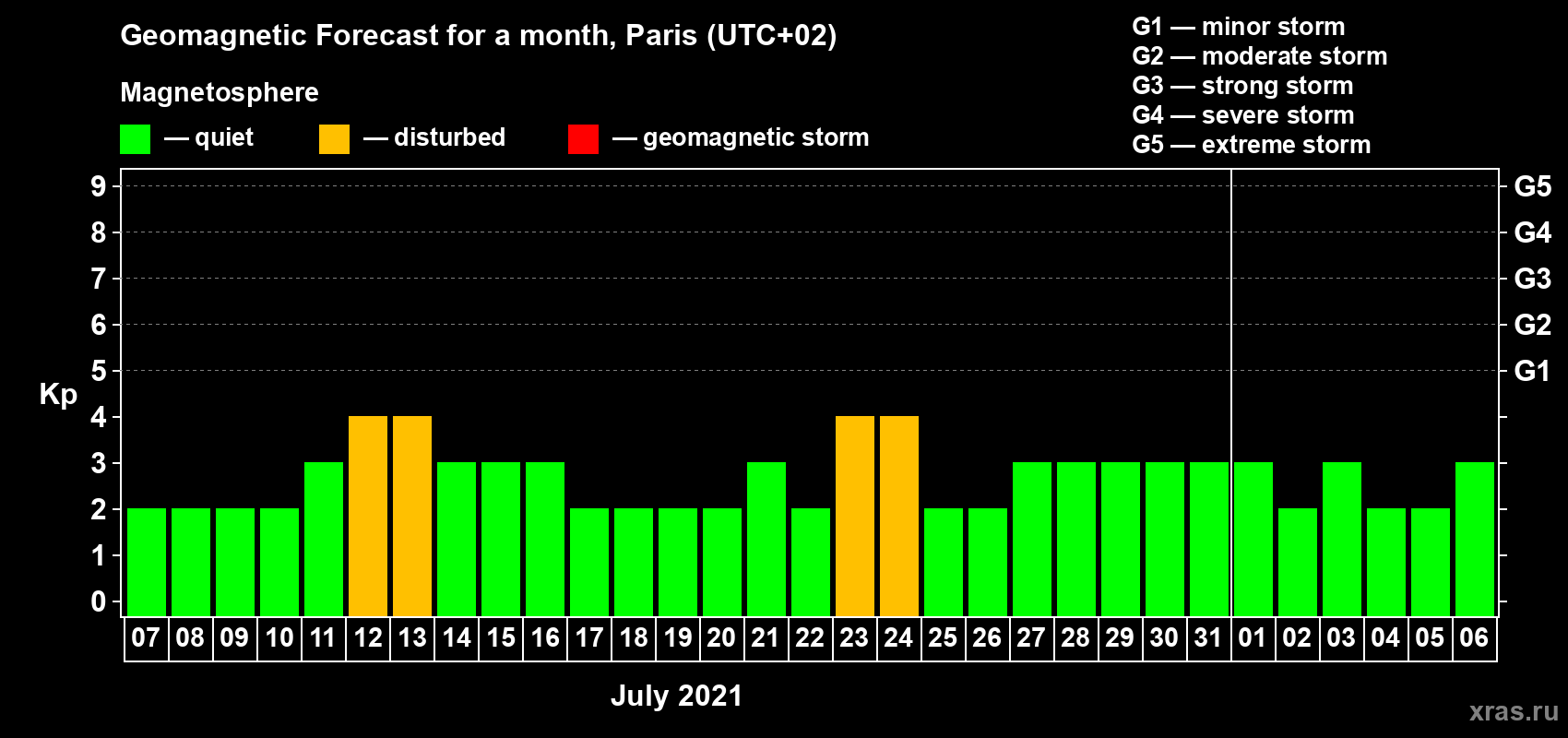 Geomagnetic storm forecast in Paris for Jul 07, 2021