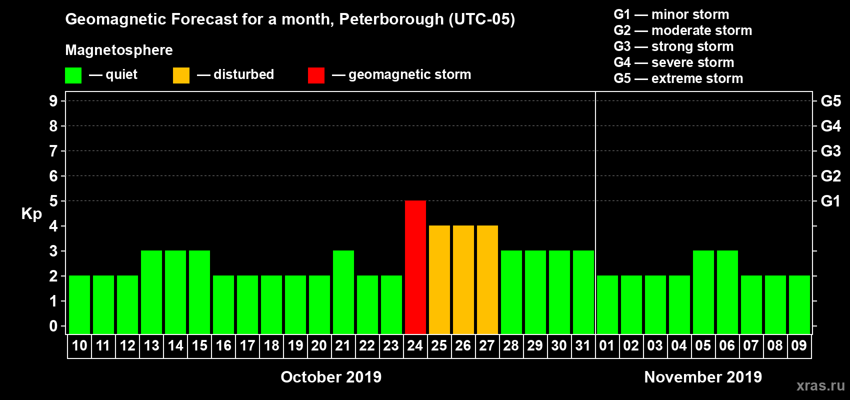 Geomagnetic storm forecast in Peterborough for Oct 10, 2019