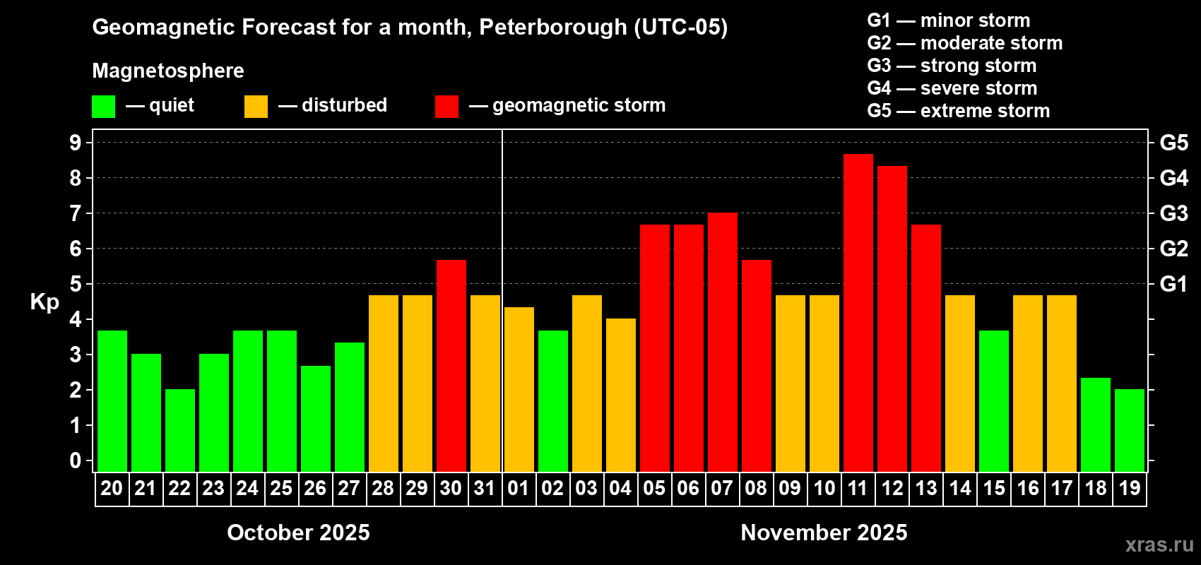 Geomagnetic storm forecast in Peterborough for Oct 20, 2025