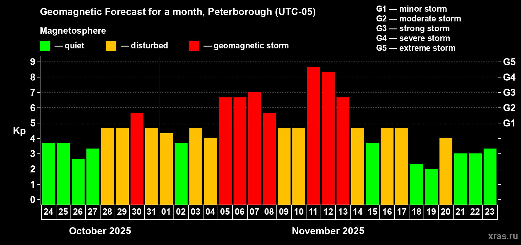 Geomagnetic storm forecast in Peterborough for Oct 24, 2025