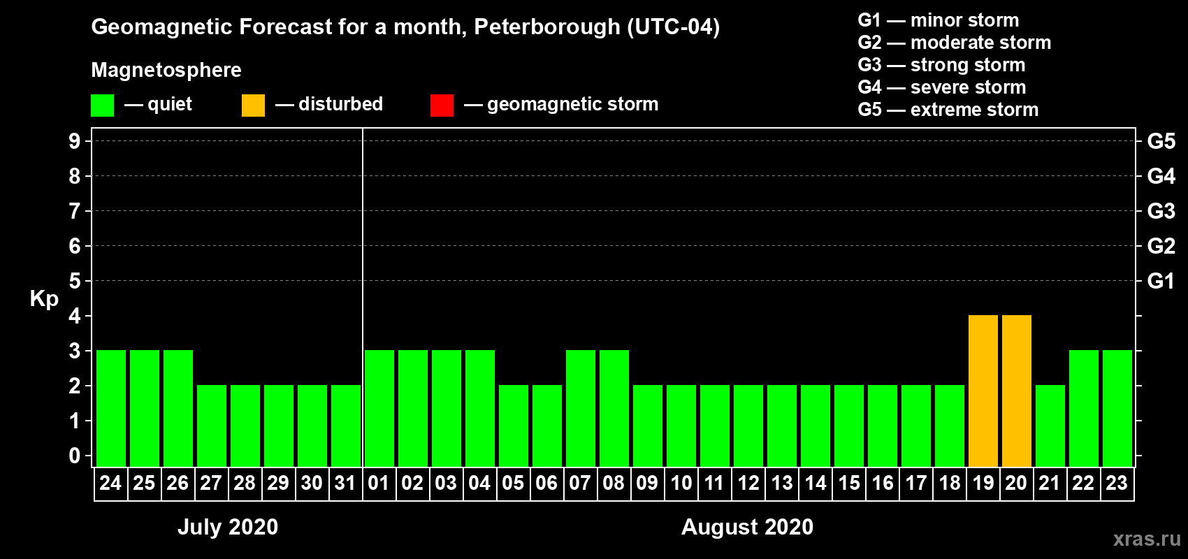 Geomagnetic storm forecast in Peterborough for Jul 24, 2020