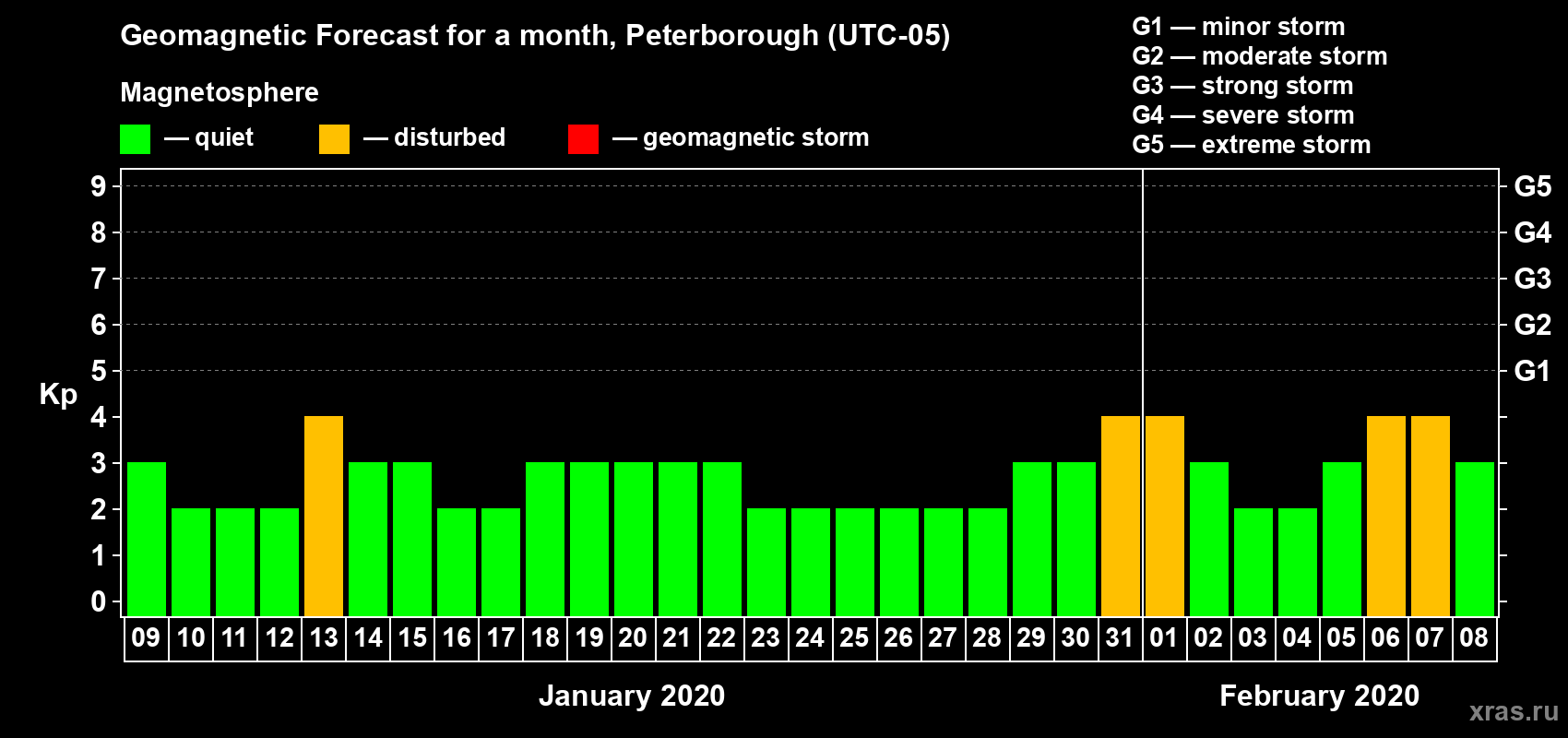Geomagnetic storm forecast in Peterborough for Jan 09, 2020