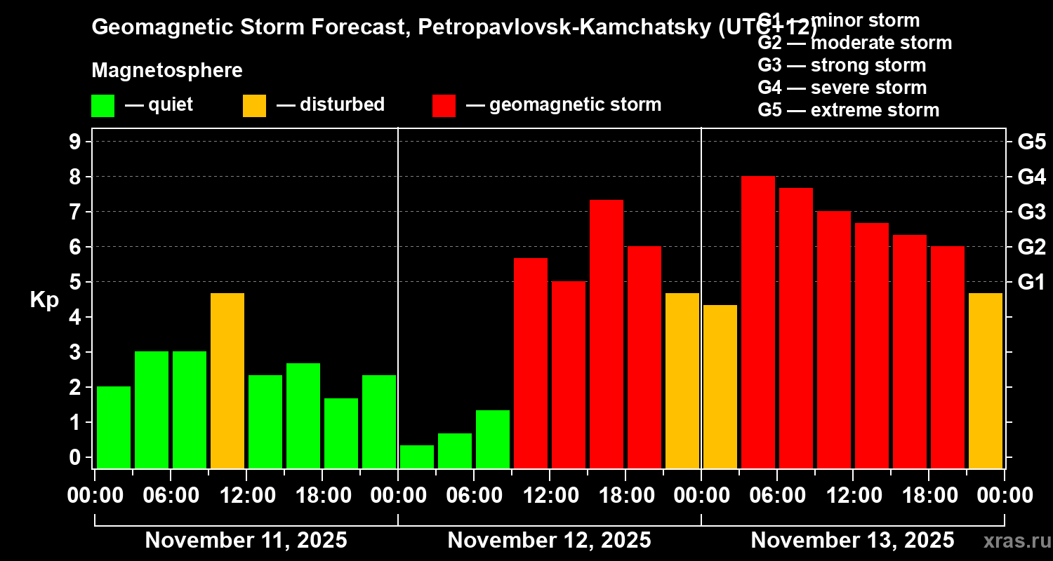 Geomagnetic storm forecast in Petropavlovsk-Kamchatsky for Nov 11, 2025