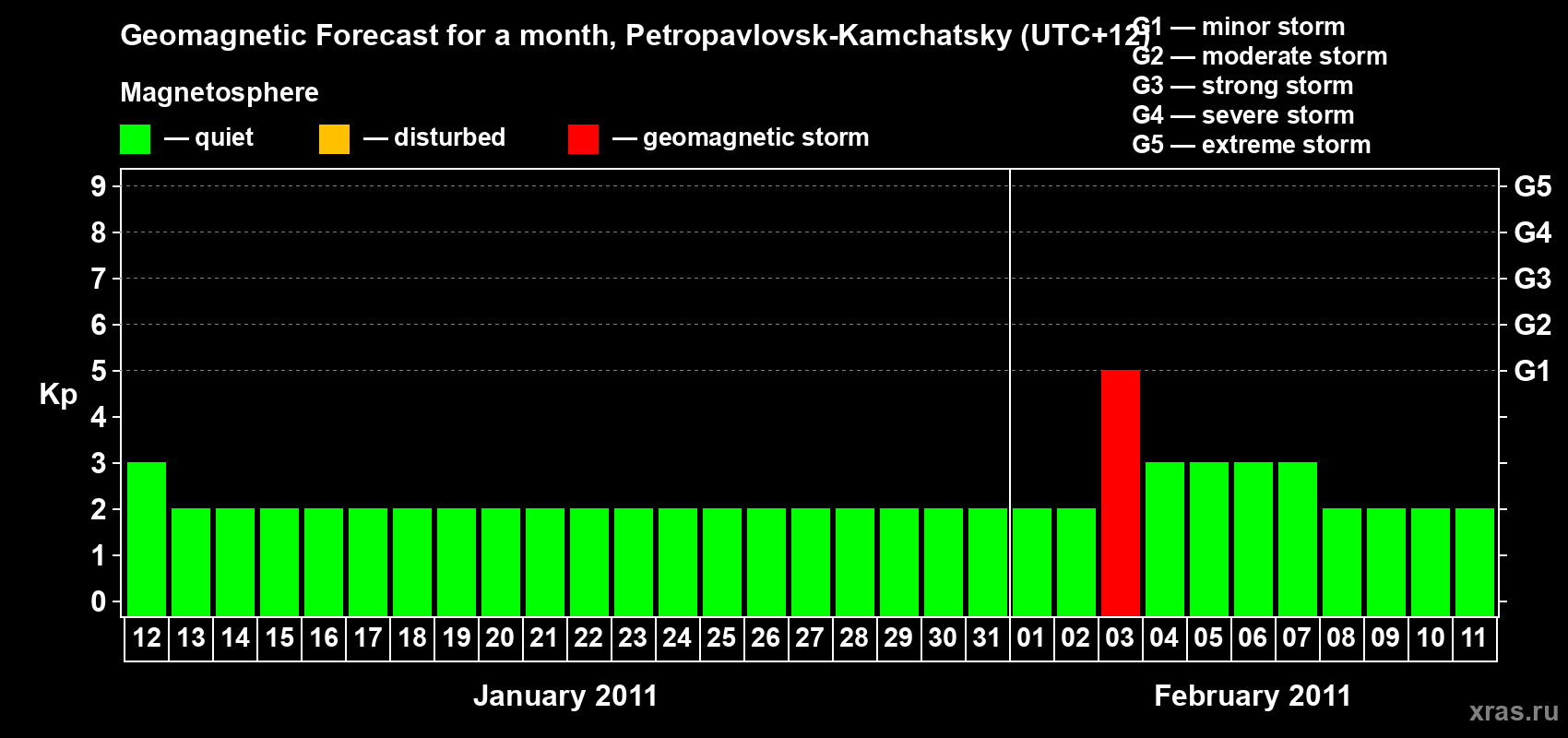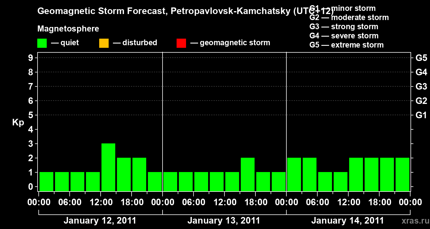 Geomagnetic storm forecast in Petropavlovsk-Kamchatsky for Jan 12, 2011