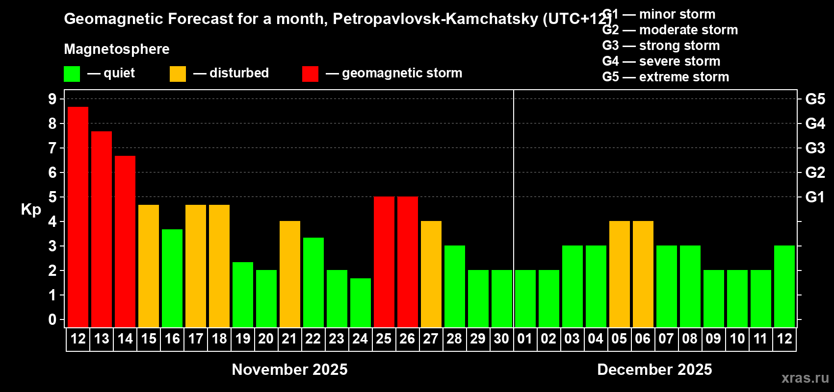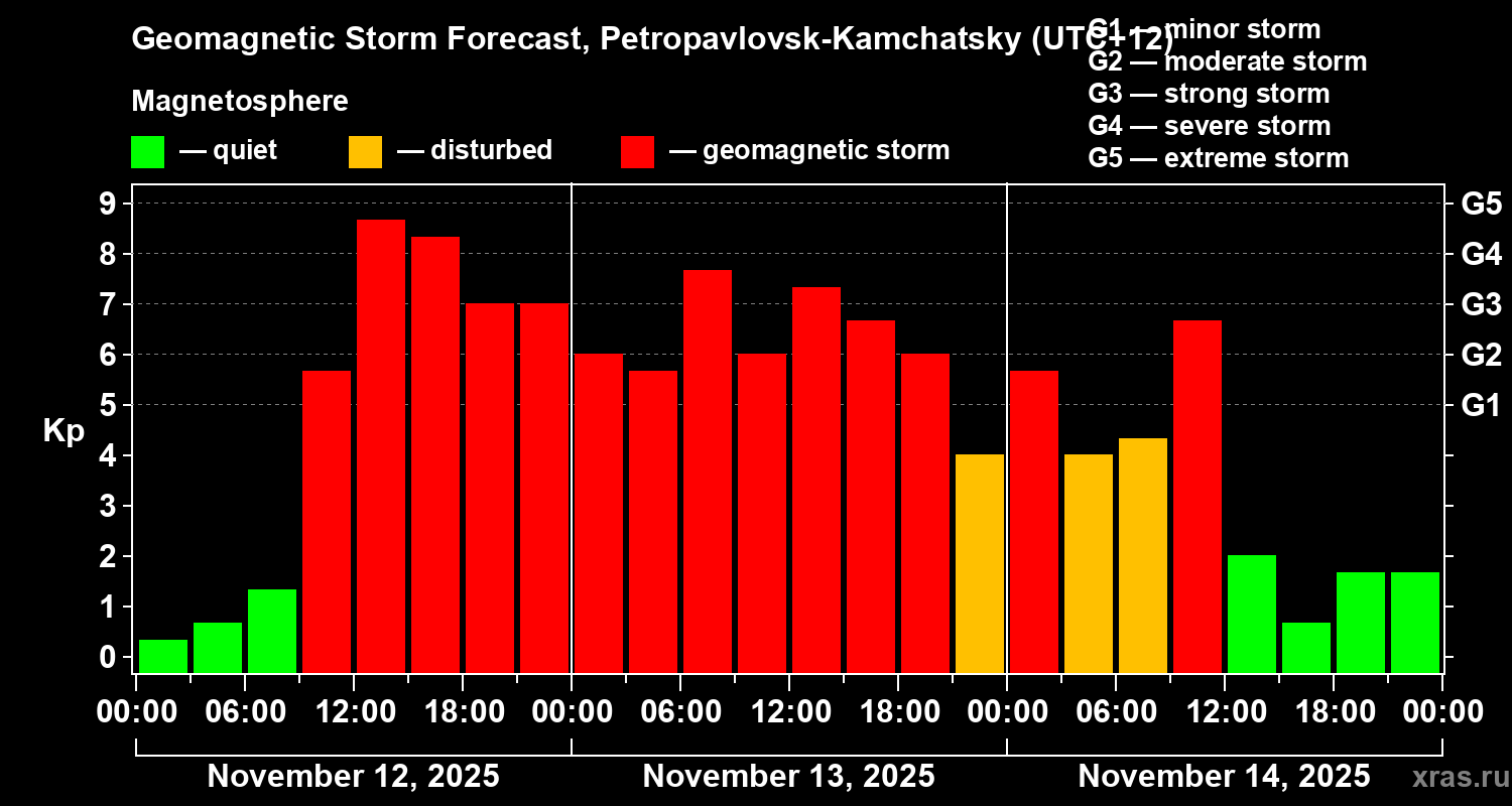 Geomagnetic storm forecast in Petropavlovsk-Kamchatsky for Nov 12, 2025