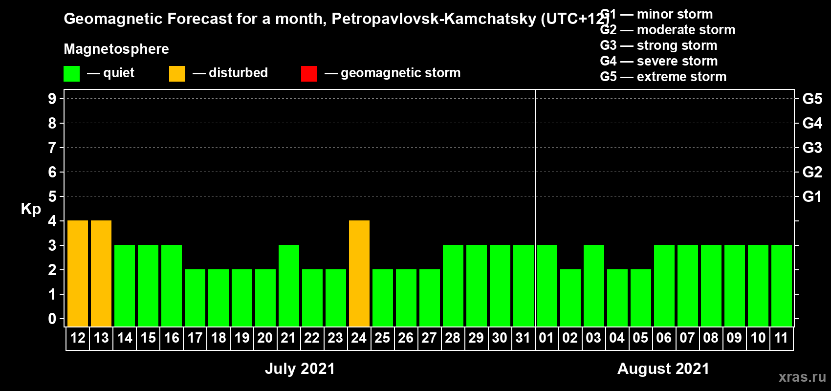Geomagnetic activity forecast in Petropavlovsk-Kamchatsky — Jul 12, 2021