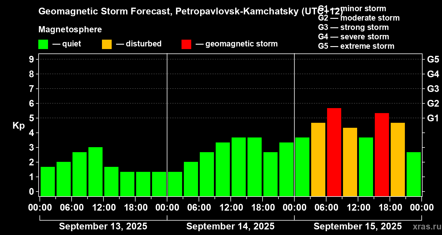 Geomagnetic storm forecast in Petropavlovsk-Kamchatsky for Sep 13, 2025