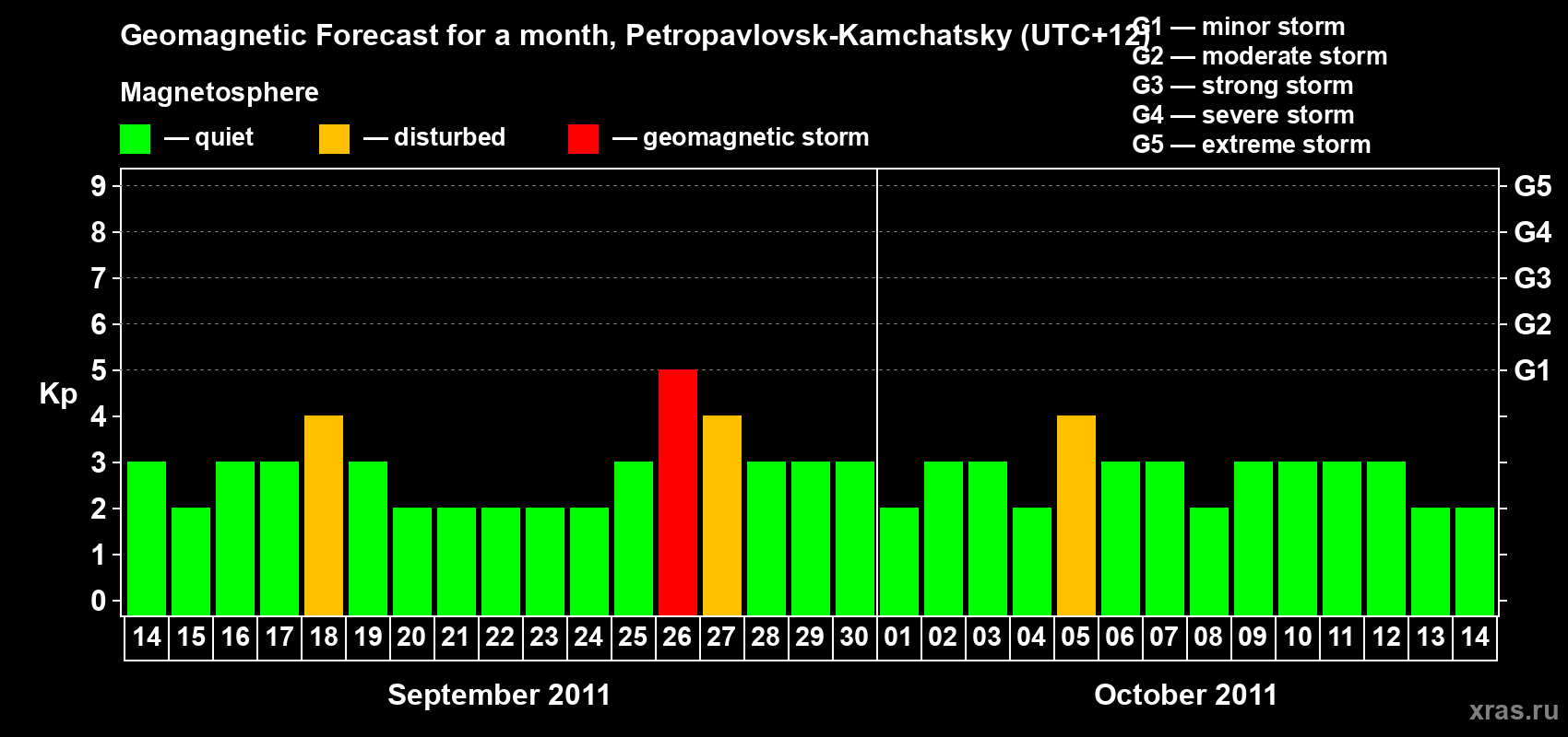 Geomagnetic storm forecast in Petropavlovsk-Kamchatsky for Sep 14, 2011