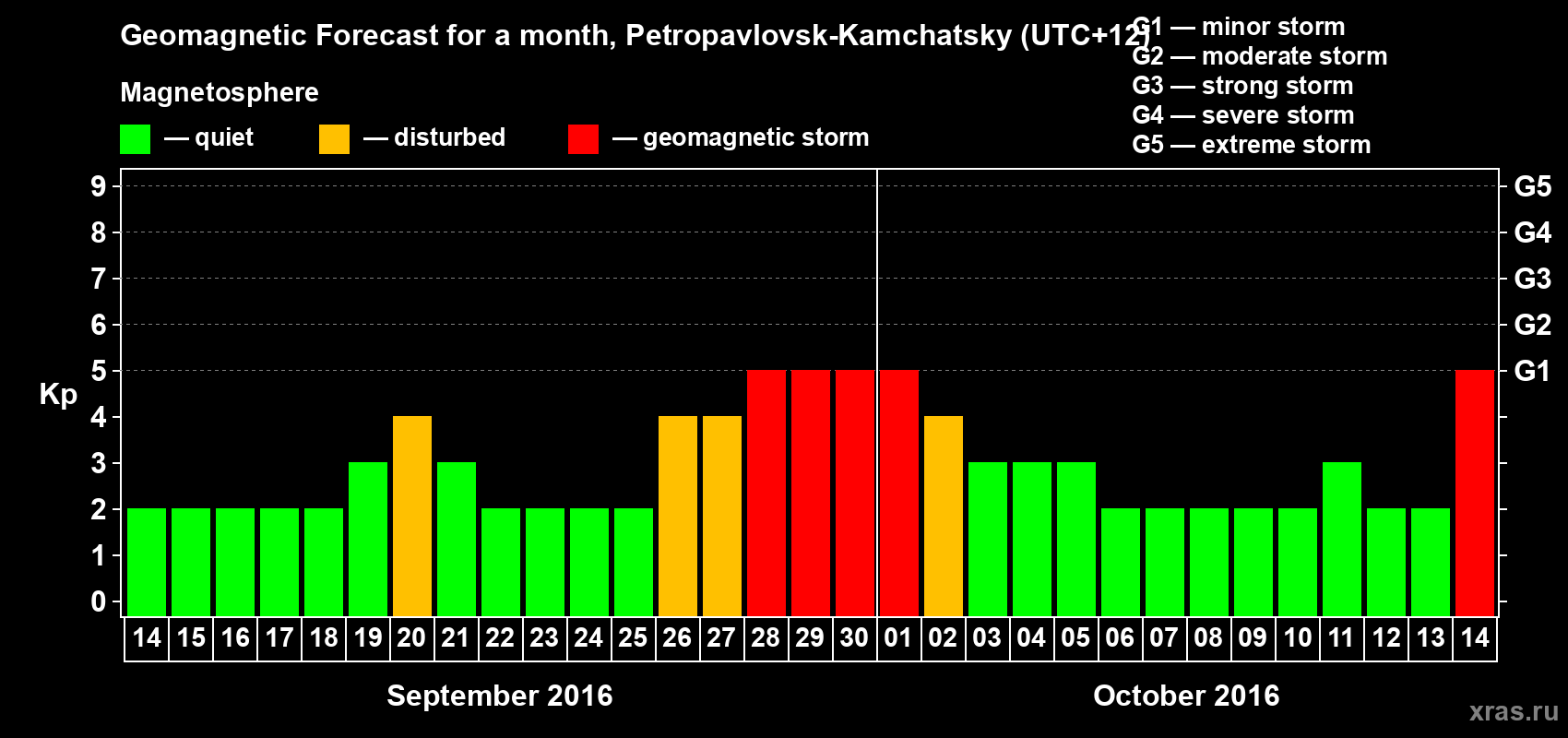 Geomagnetic storm forecast in Petropavlovsk-Kamchatsky for Sep 14, 2016