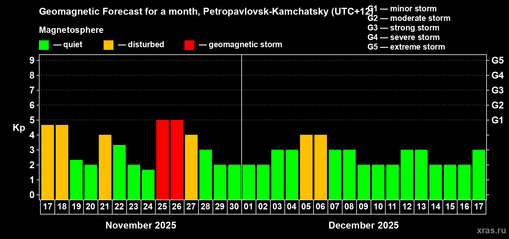 Geomagnetic storm forecast in Petropavlovsk-Kamchatsky for Nov 17, 2025