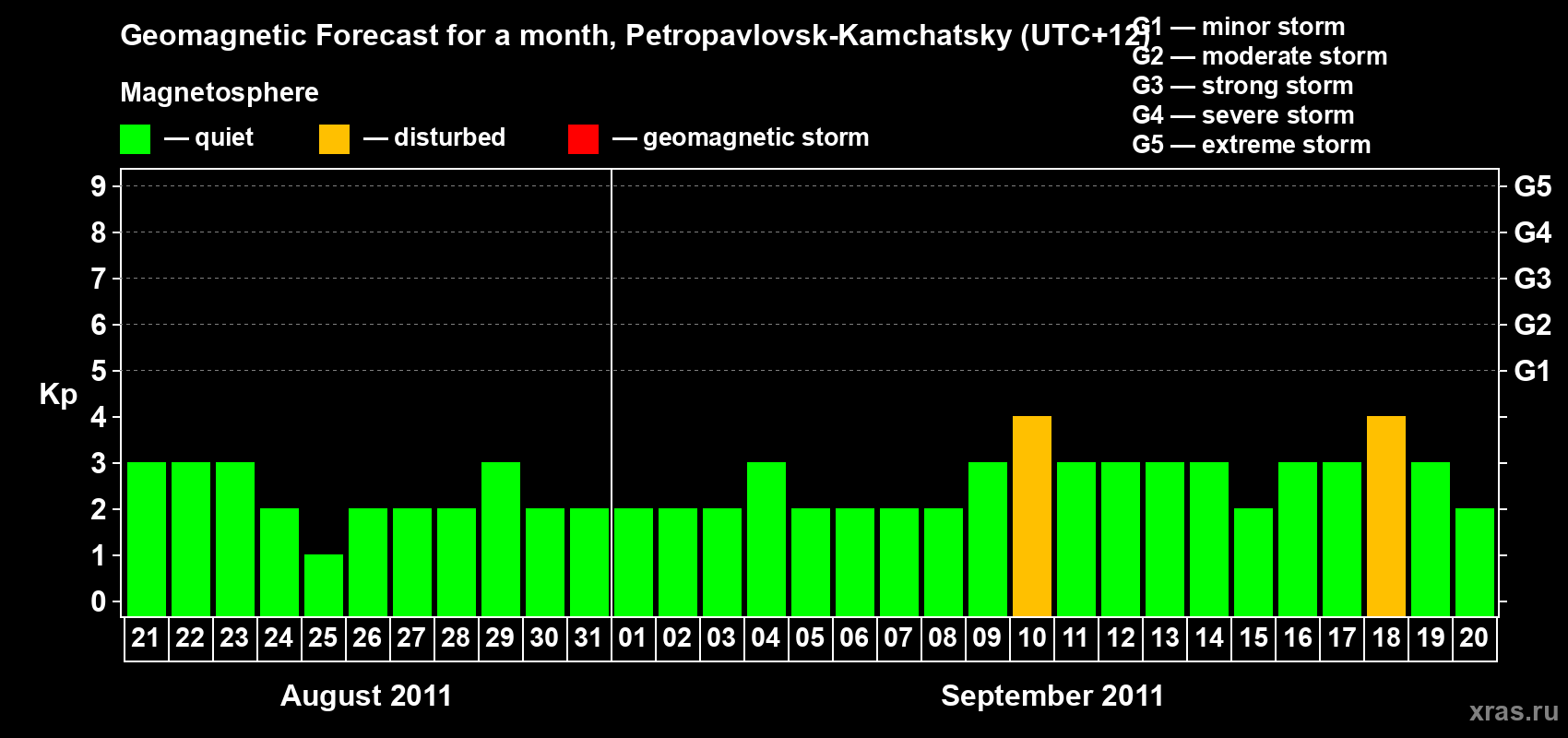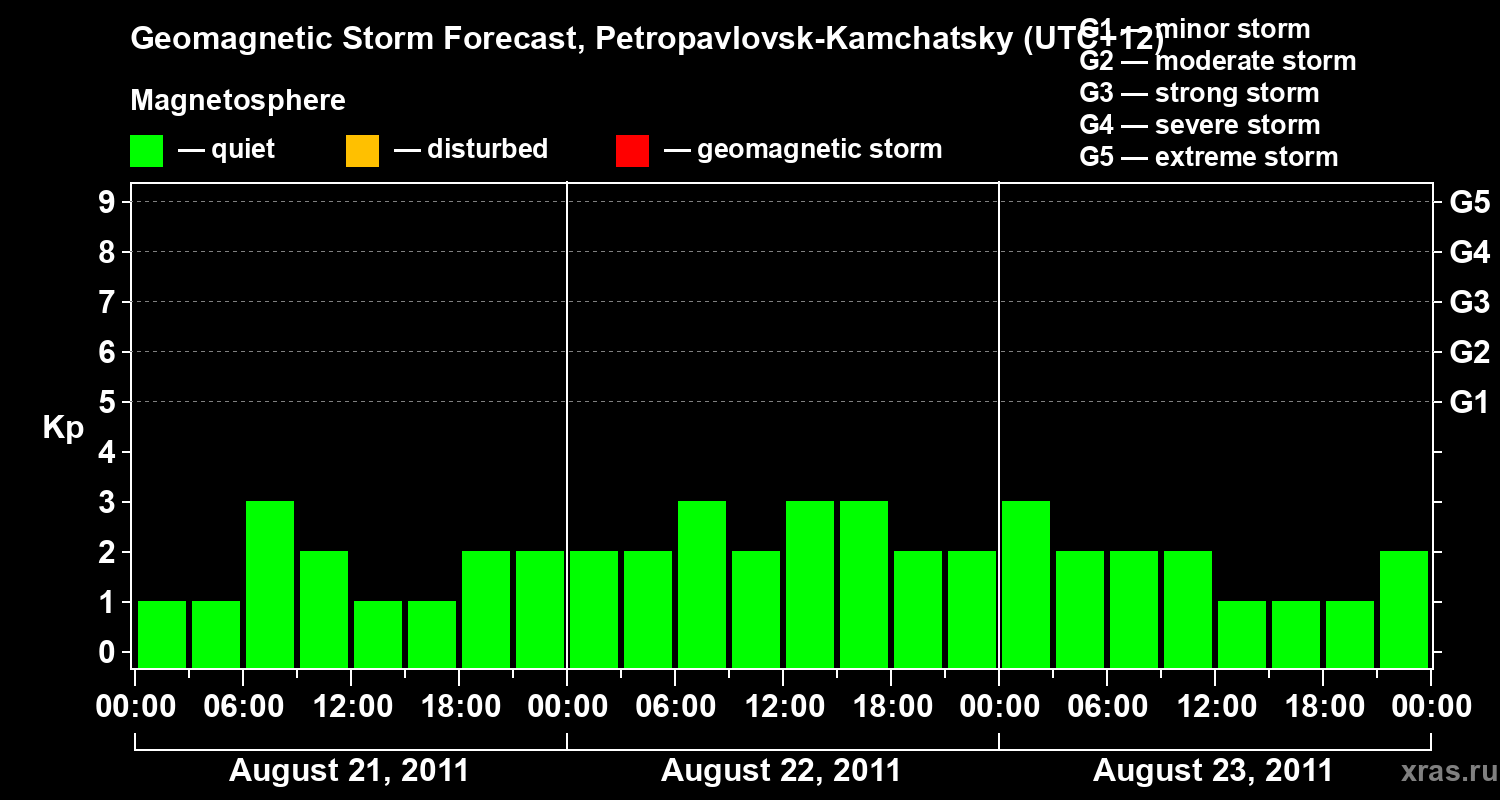 Geomagnetic storm forecast in Petropavlovsk-Kamchatsky for Aug 21, 2011