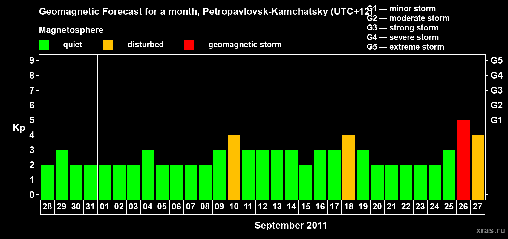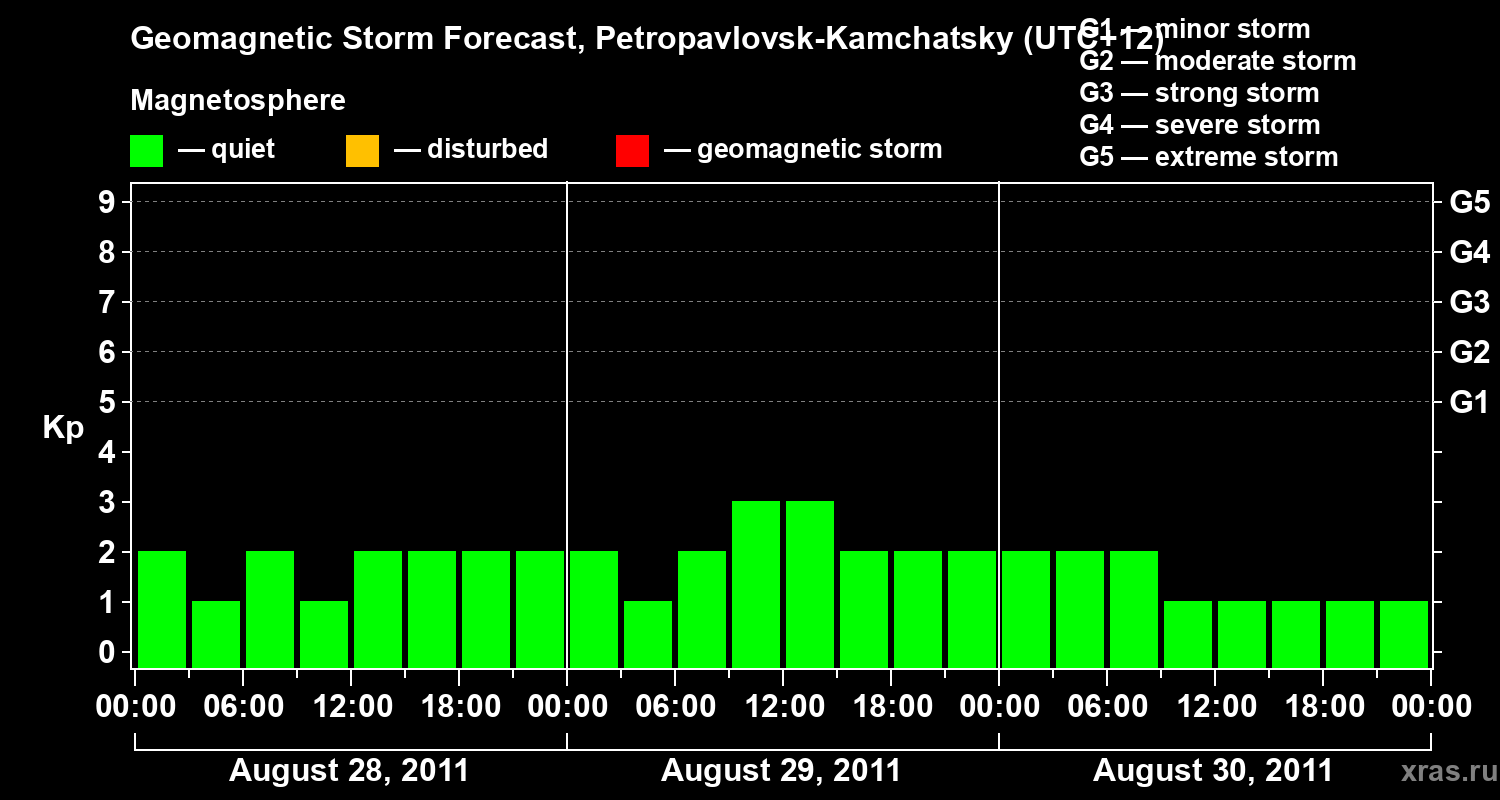 Geomagnetic storm forecast in Petropavlovsk-Kamchatsky for Aug 28, 2011