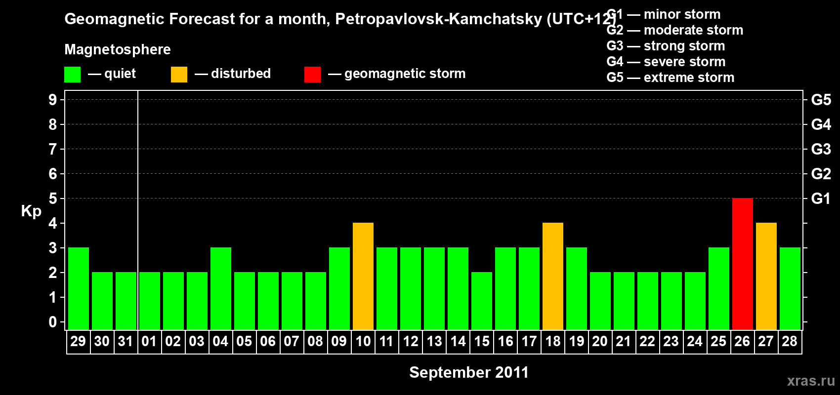 Geomagnetic storm forecast in Petropavlovsk-Kamchatsky for Aug 29, 2011