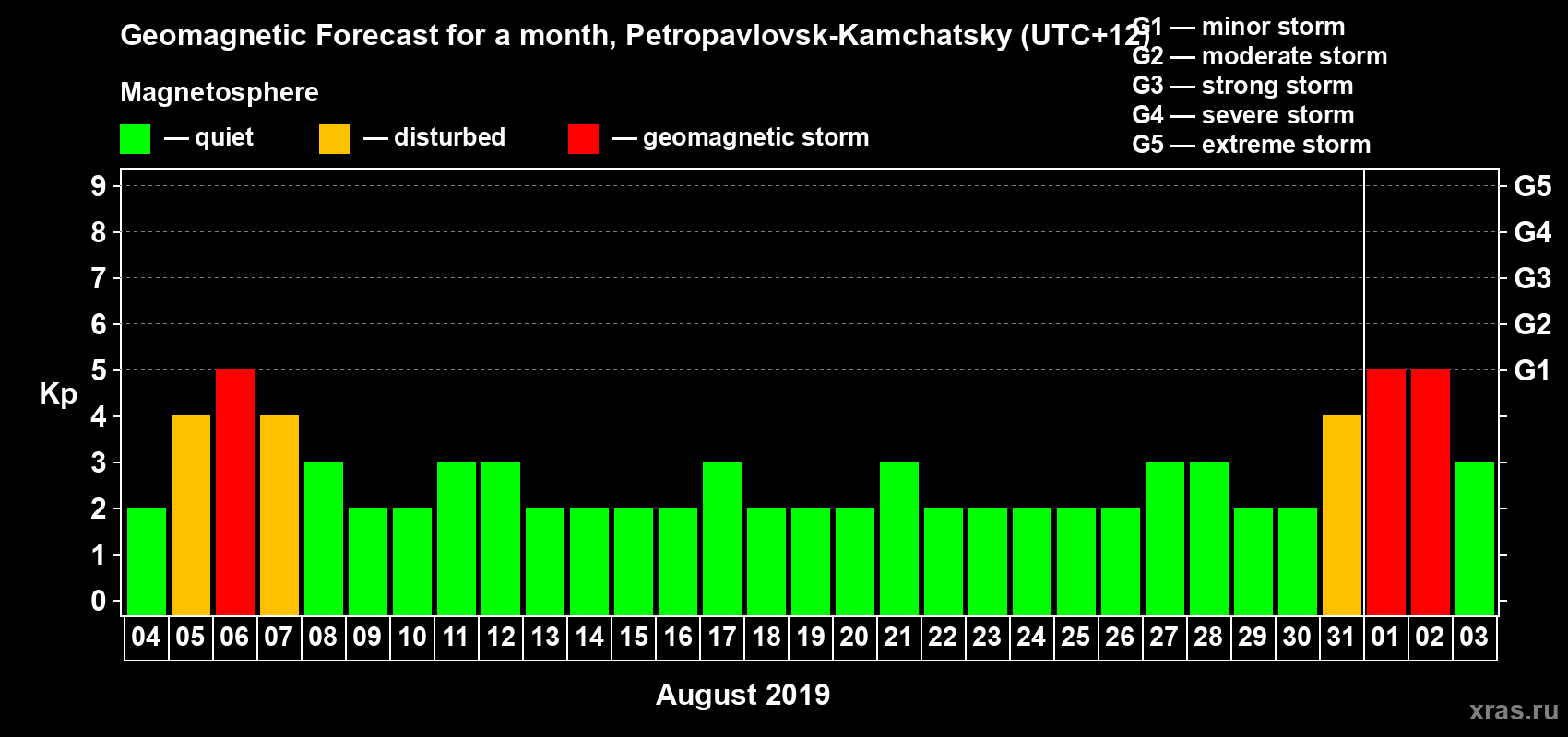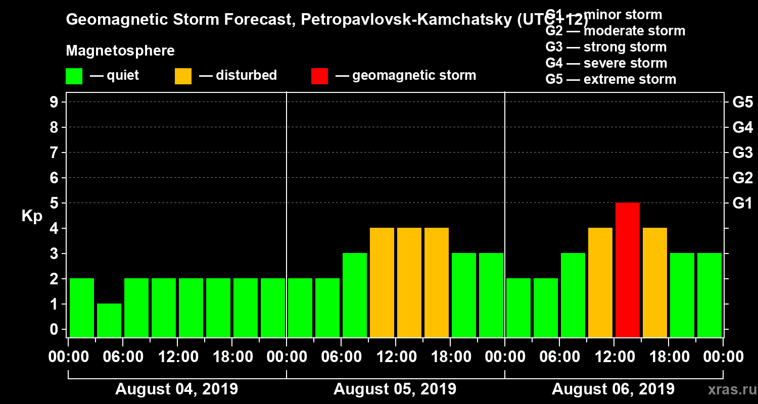 Geomagnetic storm forecast in Petropavlovsk-Kamchatsky for Aug 04, 2019