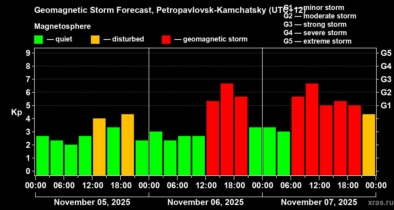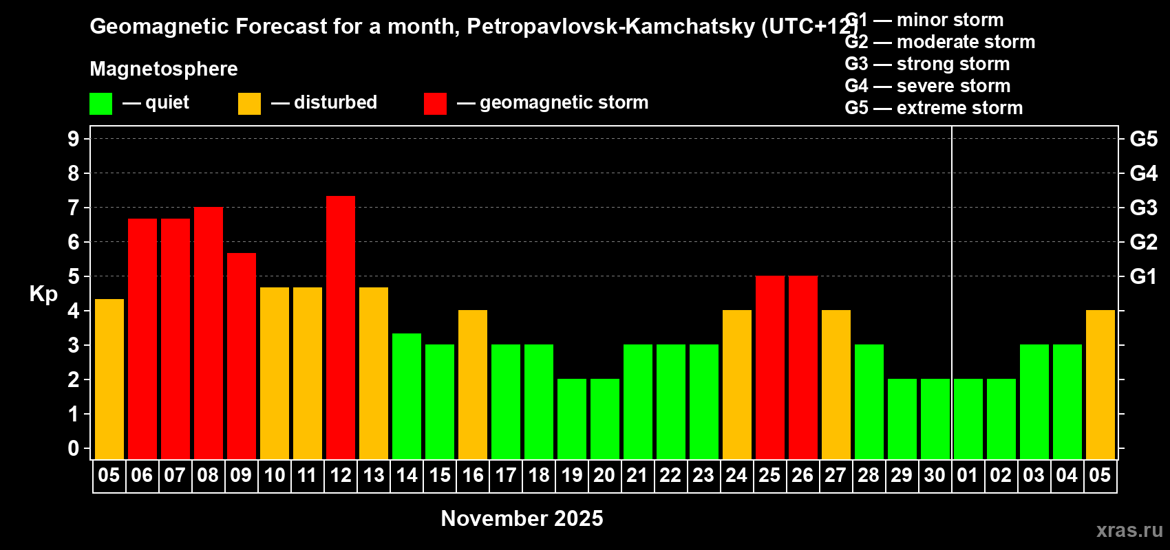 Geomagnetic storm forecast in Petropavlovsk-Kamchatsky for Nov 05, 2025