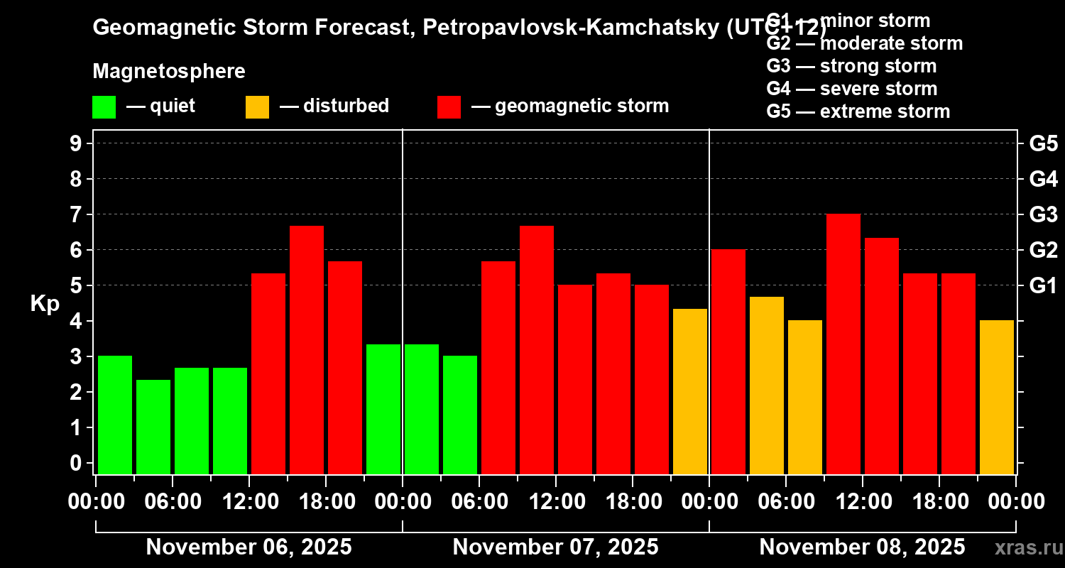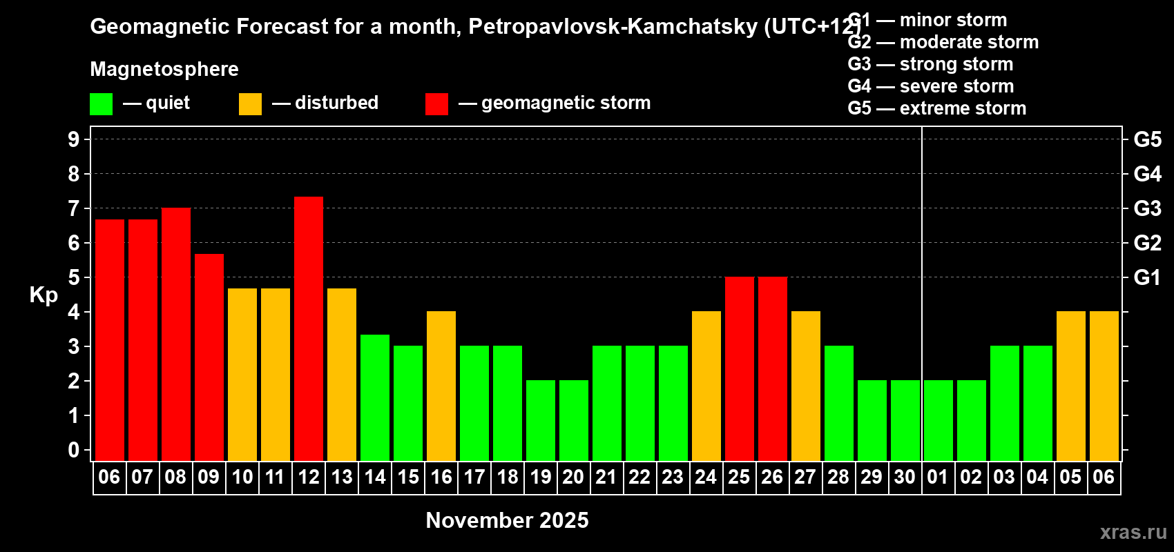 Geomagnetic storm forecast in Petropavlovsk-Kamchatsky for Nov 06, 2025