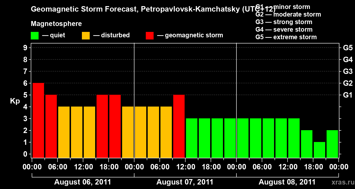 Geomagnetic storm forecast in Petropavlovsk-Kamchatsky for Aug 06, 2011