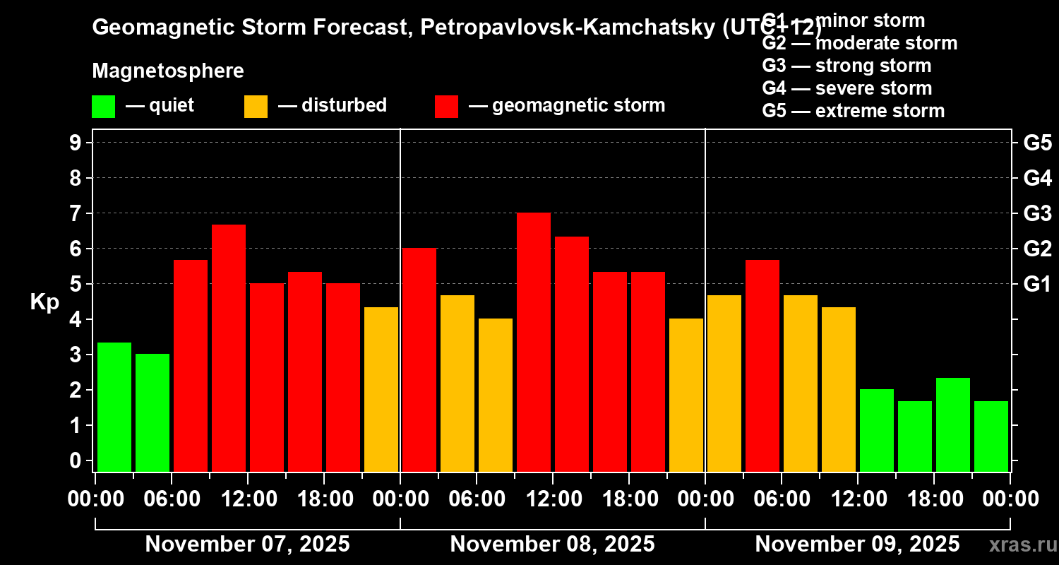 Geomagnetic storm forecast in Petropavlovsk-Kamchatsky for Nov 07, 2025
