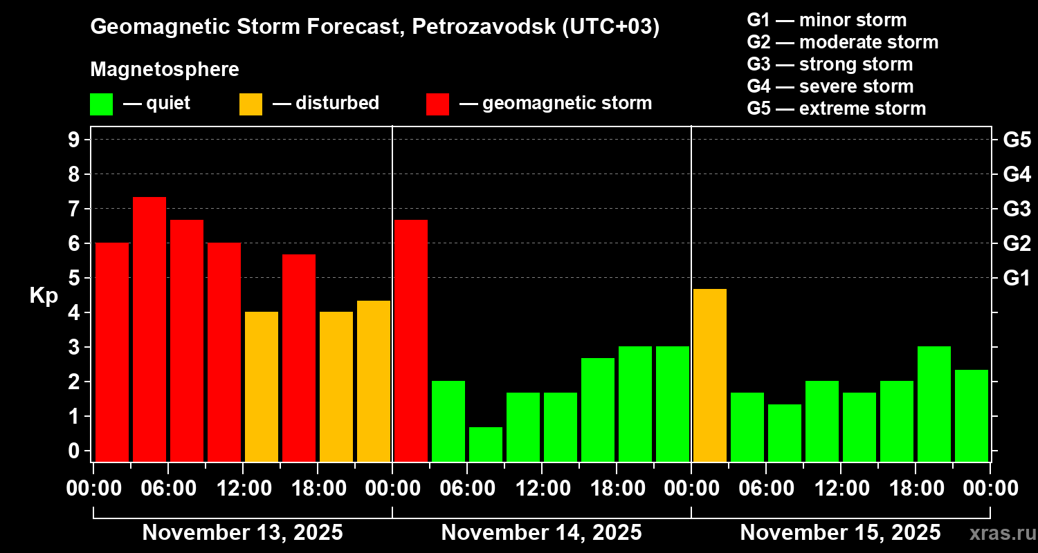 Geomagnetic storm forecast in Petrozavodsk for Nov 13, 2025