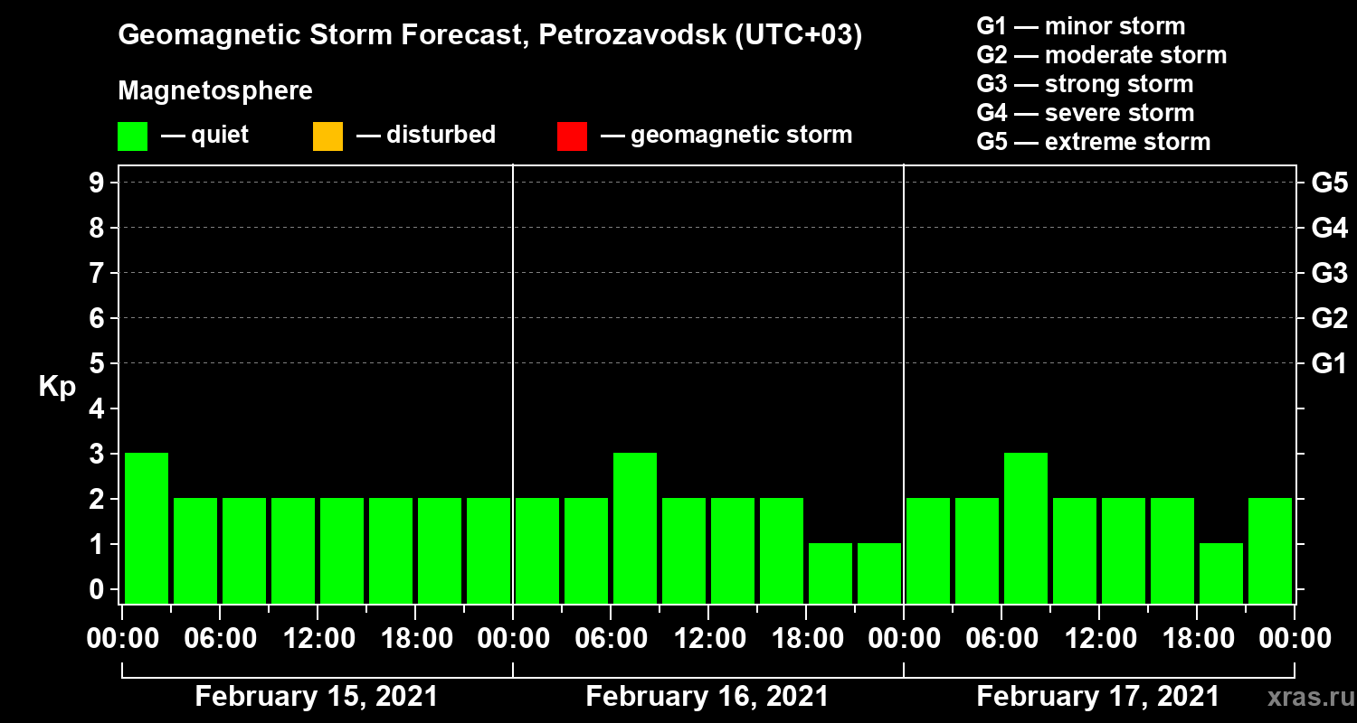 Geomagnetic storm forecast in Petrozavodsk for Feb 15, 2021