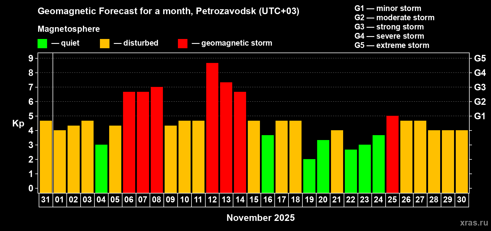 Geomagnetic storm forecast in Petrozavodsk for Oct 31, 2025