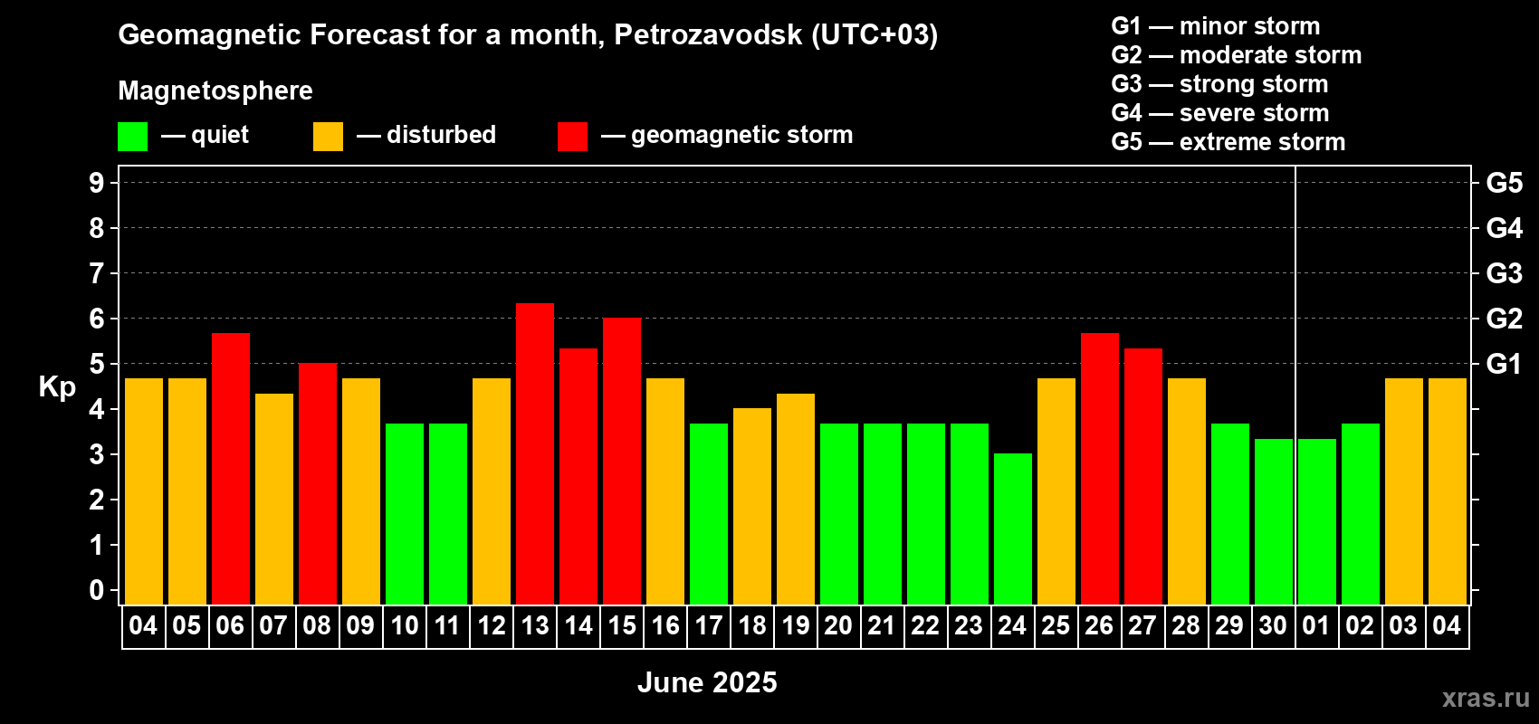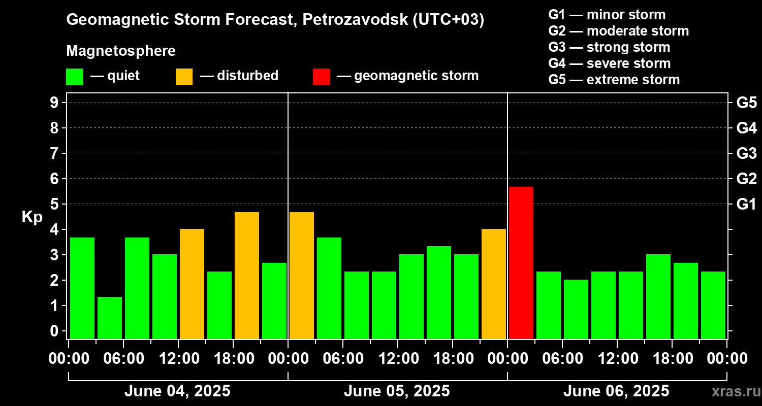 Geomagnetic storm forecast in Petrozavodsk for Jun 04, 2025